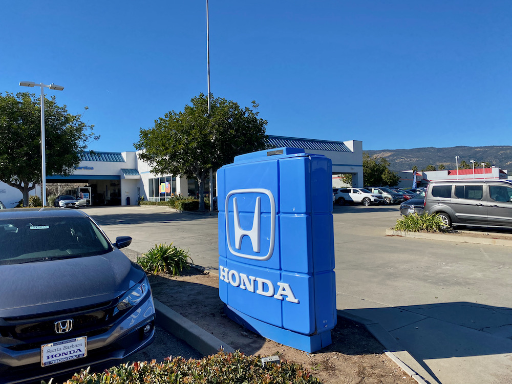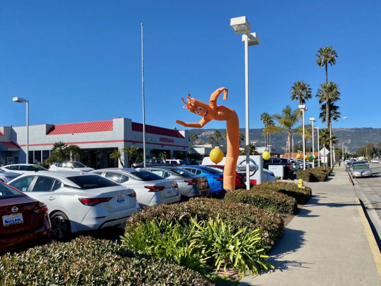 We got excited for an adventure when we saw the sign for the Old San Jose Creek public trail, but before long we were at an apartment complex. It was postmodern and colorful, but not what we were hoping for. We stayed on whatever road we ended up on, admired the Montecito-esque trees outside a house, and found ourselves on a strip of car dealerships. The Honda sign looked like it’s made of plastic and filled with water, and I took far too many photos of the inflatable guy.