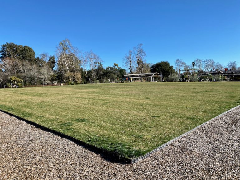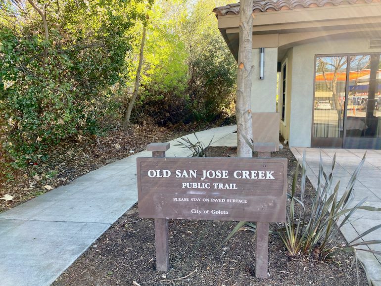 Having just about reached the 217, we crossed to the north side of Hollister and wandered into Jonny D. Wallis Neighborhood Park. (What’s the point of “Neighborhood” in the name? No one is going to confuse it with a state or national park.) The bike path is more of the Old San Jose Creek trail, it turns out.