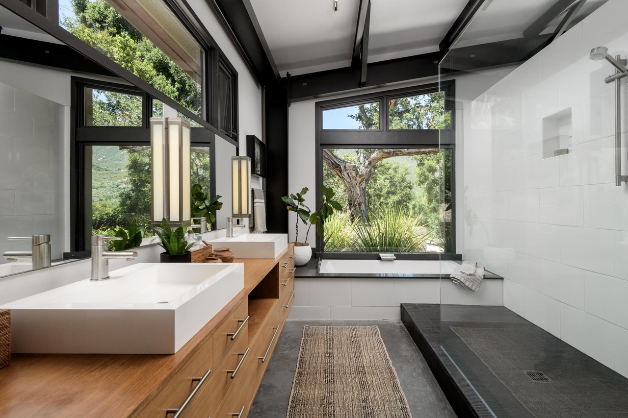 The black accents at 926 Mission Ridge Road ($4.895 million), especially in the kitchen and baths, want to be changed out, but the 1993 Don Nulty house has comfortable proportions and sits on an enviable one-acre lot with a guest house and pond, home to a family of ducks.