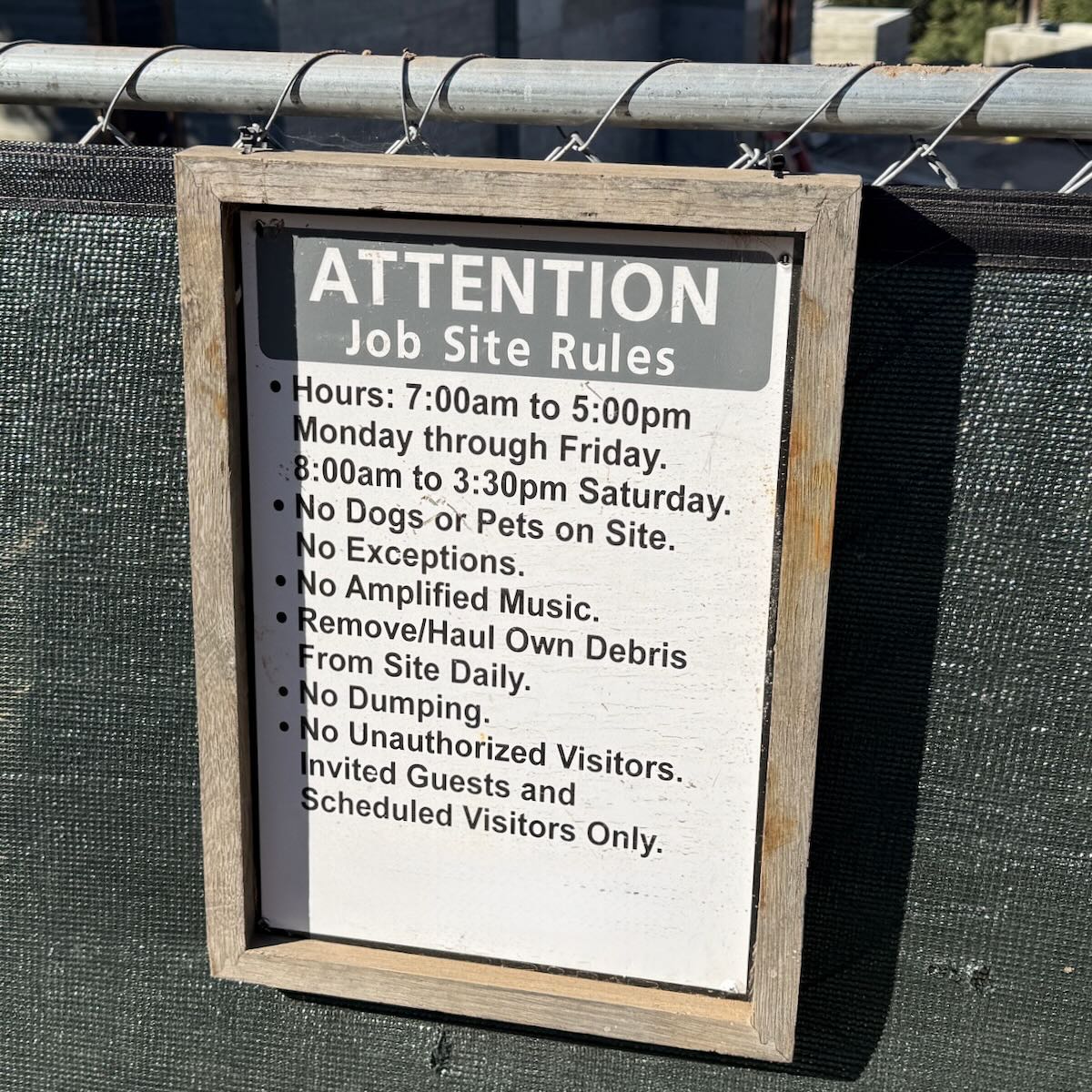 ••• I was surprised to see this sign in Montecito, because the rules for permitted construction in the county are actually different. (I deleted the company’s logo because I’m less interested in shaming someone than encouraging people to know their rights.) From the Montecito Association’s FAQ page: “Construction may take place from 7 a.m. to 4:30 p.m. Monday-Friday only. No construction shall occur on State Holidays,” of which California has quite a few. If you see or hear construction after hours, you can send time-stamped video (there’s an app) to the county’s Planning and Development department for enforcement.