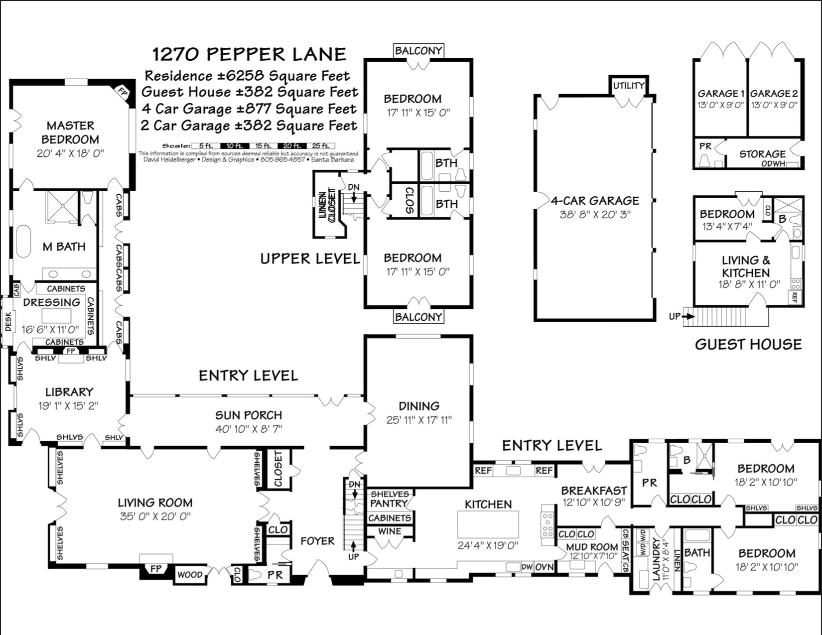 Size/Acreage: 6,258 square feet (main house); 382 square feet (guest house); 1,259 square feet (garages) / 2.2 acres.