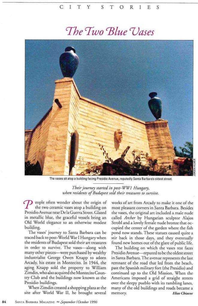 ••• A while back, Suzanne asked about the provenance of the two blue vases atop the Presidio Plaza Building next to the post office, and after I came up empty, D. wrote in with a theory that “the building was built by, owned by, or otherwise associated with Peter B. Kyne, the author of a well known book in the 1920s, The Go-Getter, or How to Be One, in which a blue vase was key to the plot. These blue vases were put on the building to honor the success of the book.” As appealing as that sounded, I was convinced that if it was true, we’d be able to find more info online. Then it occurred to me to ask the folks at the Santa Barbara Historical Museum—sure enough, they remembered a 1990 article from Santa Barbara Magazine.