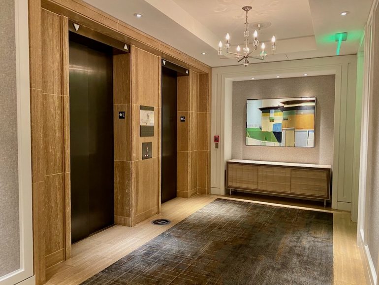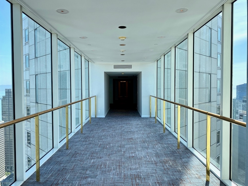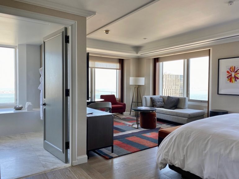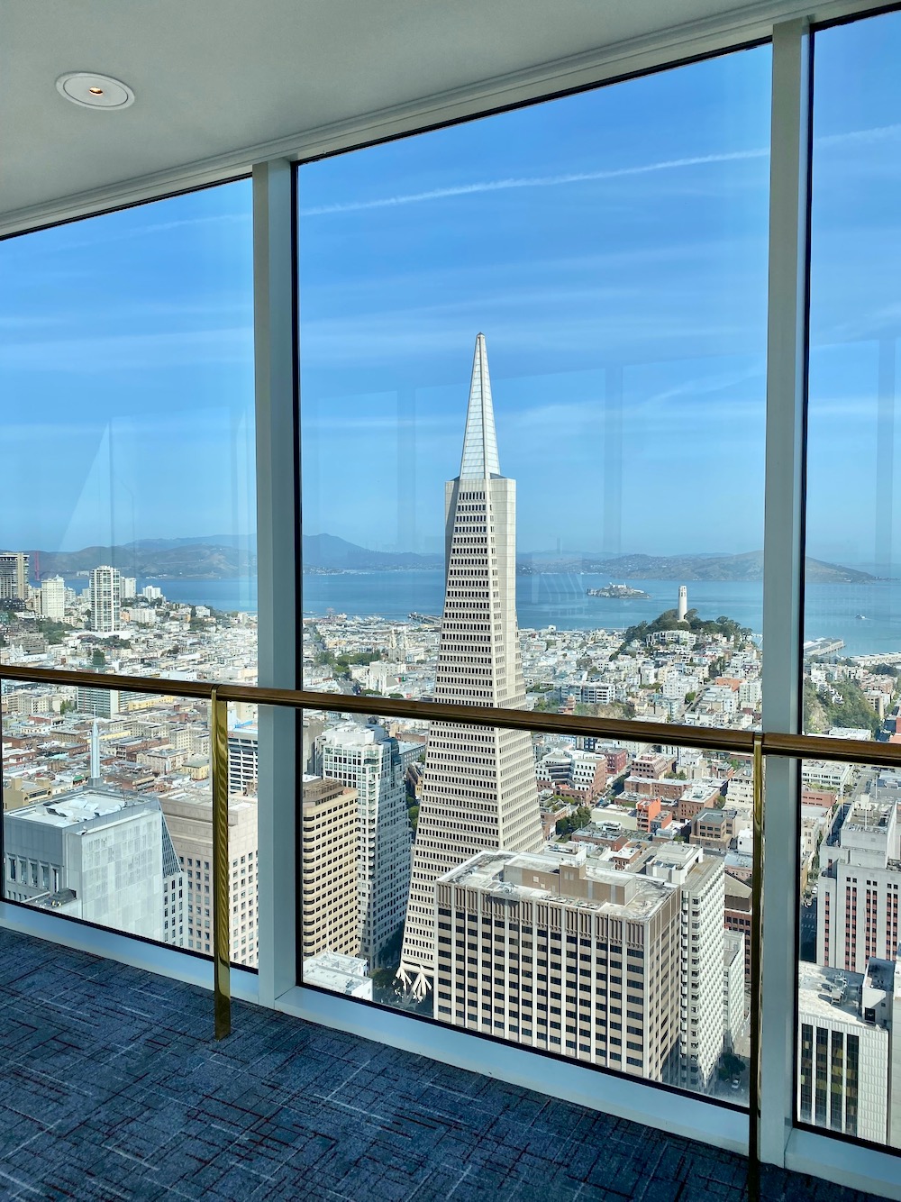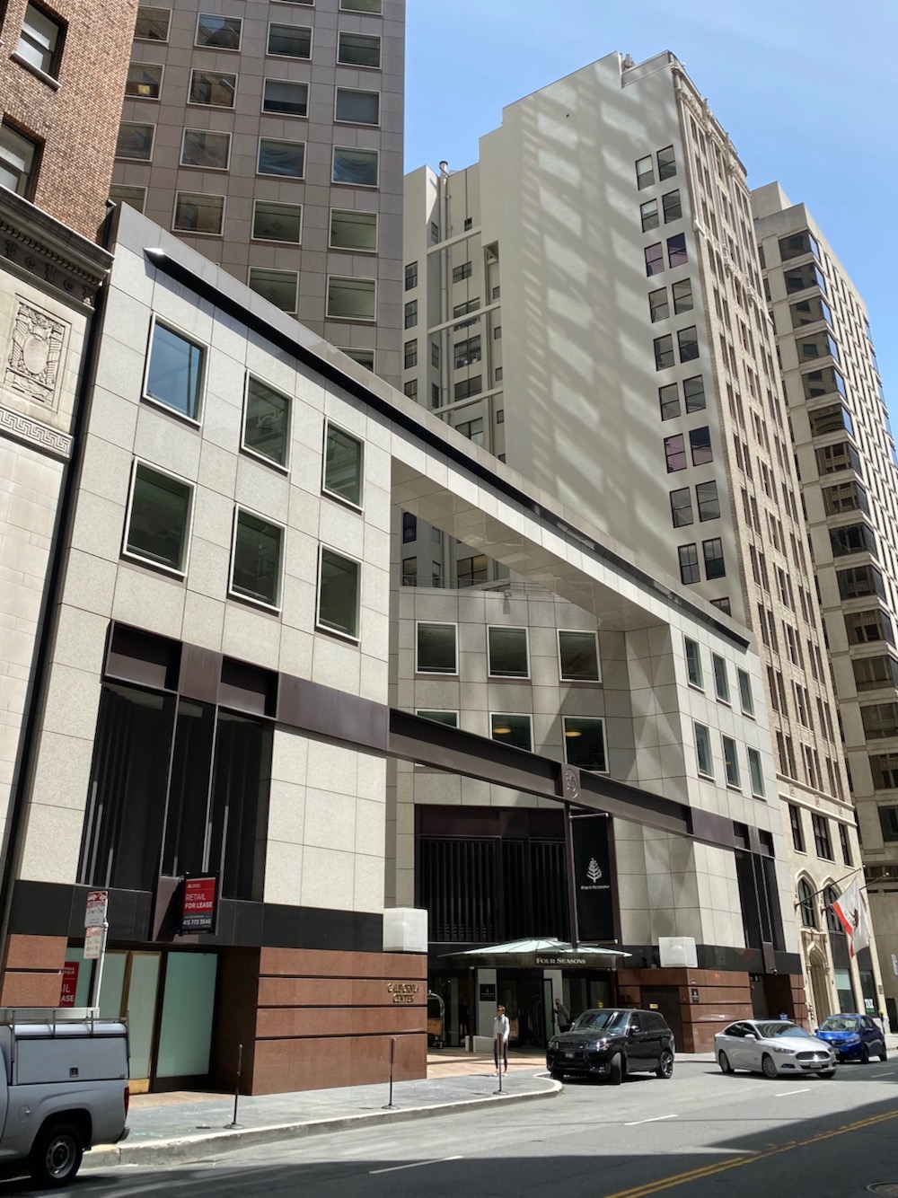 ••• On a recent visit to San Francisco, we checked out the new-ish (October 2020) Four Seasons Hotel San Francisco at Embarcadero in the Financial District. We had stayed in the building before—first when it was a Mandarin Oriental and then when it was reflagged as the Loews Regency. As always, the main draw is the view: the hotel is on floors 38-48, and the two towers are linked by a spectacular glass hallway. While the service was as you’d expect, the decor was pretty cheap, and I can’t imagine it will wear well, so if you’re going to go, do it soon. P.S. The lone social-distancing marker in the elevator lobby cracks me up. UPDATE 5/15: “The FS is currently under contract to be sold,” commented Dave. “You can bet the new owners will be tasked with bringing the decor & furnishings up to FS brand standard.” (As with the Four Seasons Biltmore, hotels are often owned and run by separate entities.)