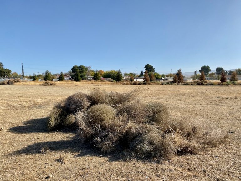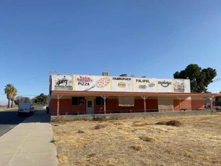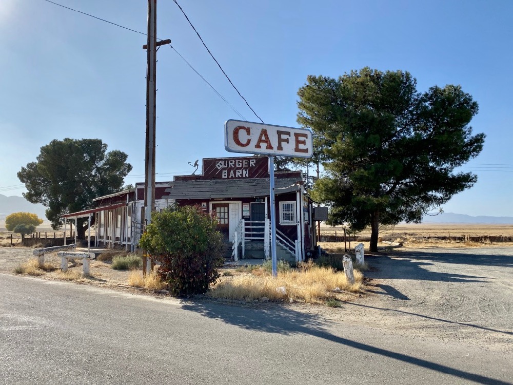 My husband and I arrived in time for lunch—the meat loaf was excellent—after which I suggested a walk. Exploring the commercial strip took all of 10 minutes: There’s a market, junk shop, laundromat, deli, community center, gas station, and, most photogenic, the ruins of the Burger Barn restaurant, which has moved in with the deli. (I took a city slicker’s delight in the piles of tumbleweeds.) Across the street is nothing but scenery.