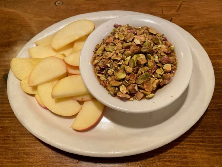 On the plus side, the food was generally excellent. Standouts were the aforementioned meat loaf, the tri-tip sandwich, the roasted sweet potatoes, and the cowboy pie (akin to shepherd’s pie). In a league of its own, and the best dessert I’ve had in the past 12 months: a homemade dish of dulce de leche topped with roasted pistachios and served with sliced apple for dipping. The dulce de leche was voluptuous, like pudding fit for royalty.