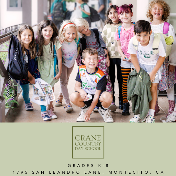 At Crane, we believe that doing deepens discovery and learning is a journey, not a destination. We know that engaging not just minds, but also hands and hearts leads to real transformation. We teach students to find joy in the pursuit, value your voice, cultivate kindness, and put we before me. Crane School serves students in Kindergarten through Grade 8 on our 12-acre campus in Montecito (1795 San Leandro Lane, Santa Barbara, CA 93108). Experience Crane today! Schedule a tour or contact us for admissions and tuition assistance information, 805-969-7732 ext. 106, or https://www.craneschool.org/admission.