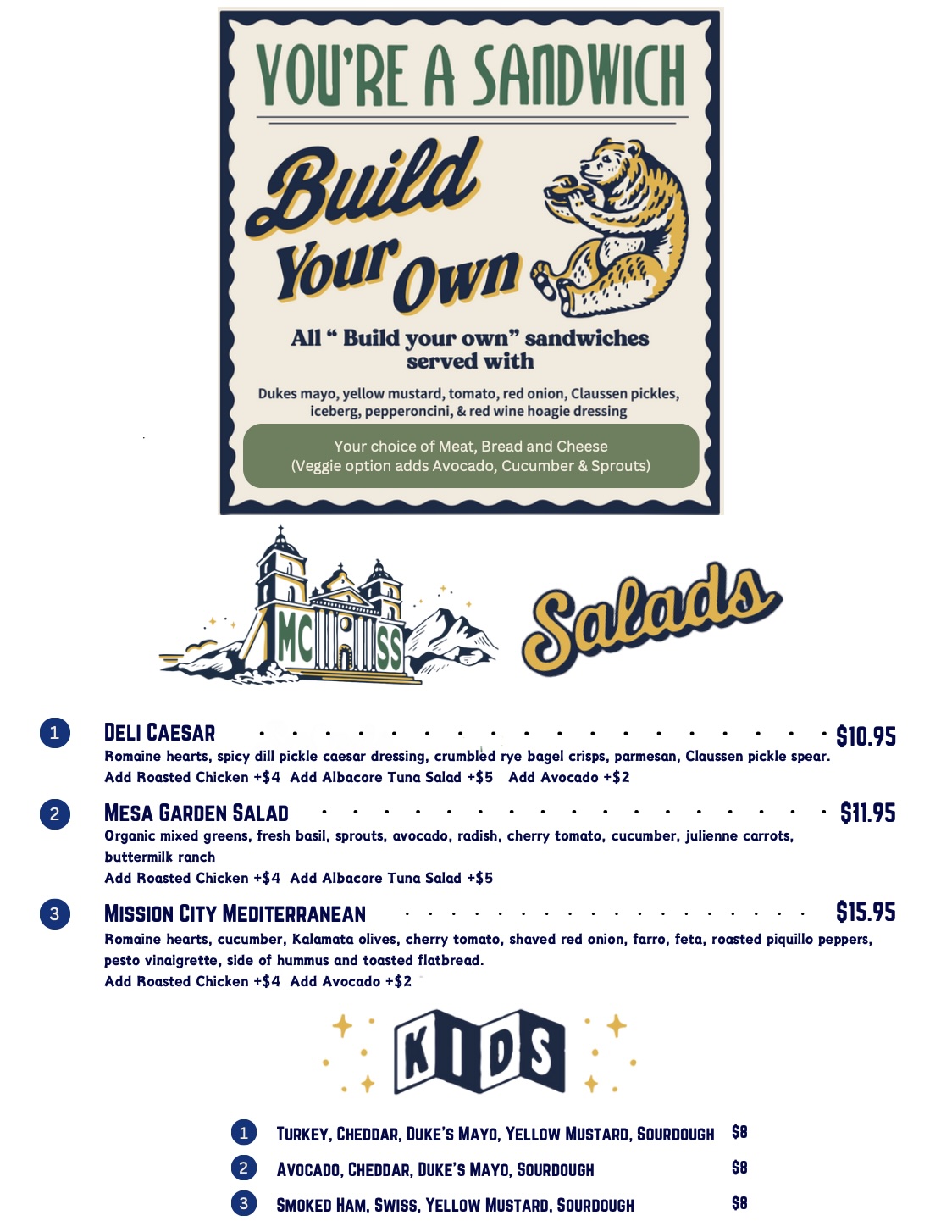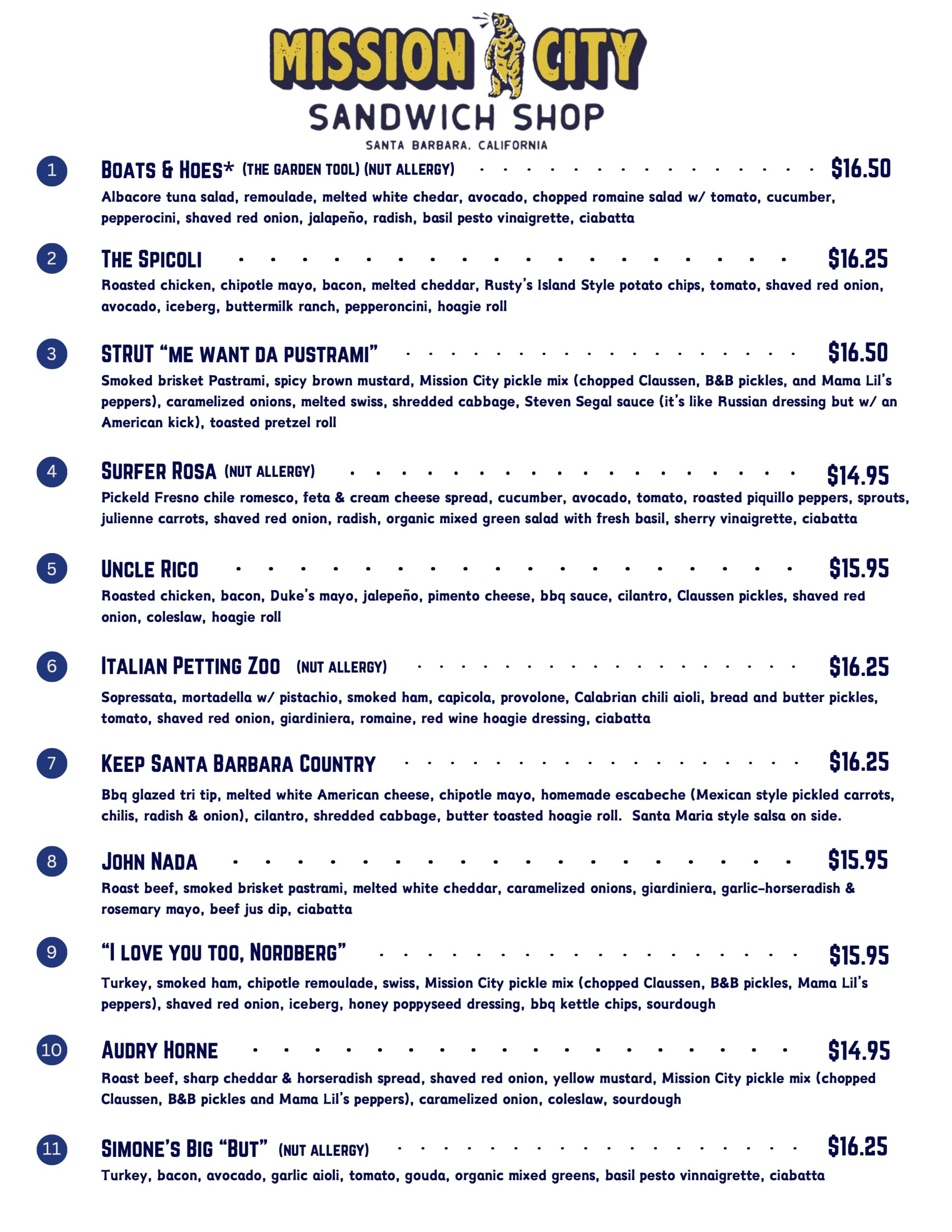 ••• Mission City Sandwich Shop, in the former Sweetie’s ice cream shop on the Mesa, will open February 13. Here’s a first look at the menu. I can’t decide between the Boat & Hoes and the Surfer Rosa….