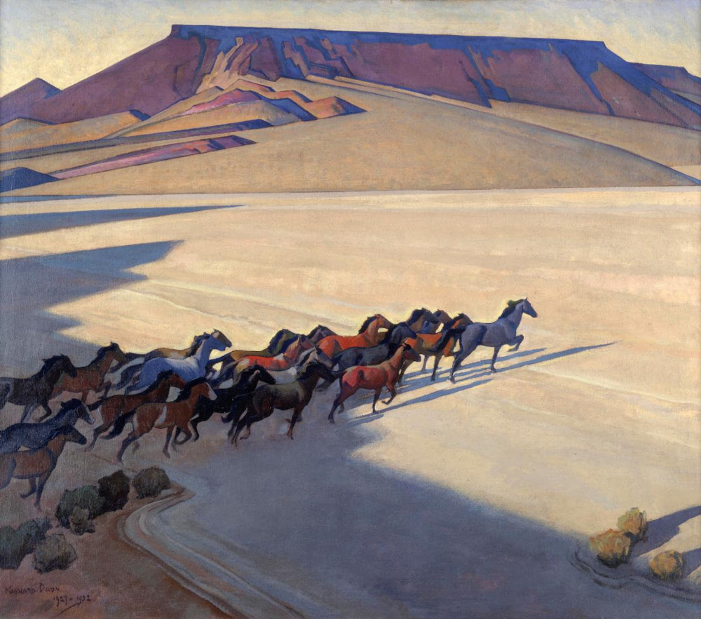 ••• Up now through January 22 at the Santa Barbara Historical Museum: Borein and His Circle of Friends, an exhibit about “one of Santa Barbara’s most celebrated citizens and artists, Edward Borein, and his many artist friends. In our two temporary exhibition galleries, you’ll find Ed’s portrait surrounded by works from twenty of his friends, including Carl Oscar Borg, Colin Campbell Cooper, Maynard Dixon, Frank Tenney Johnson, John Marshall Gamble, Alexander Harmer, Fernand Lungren, Thomas Moran, and Charles M. Russell.” Below: Maynard Dixon’s “Wild Horses of Nevada” (1927), from the collection of the Karges Family Trust in Carmel.