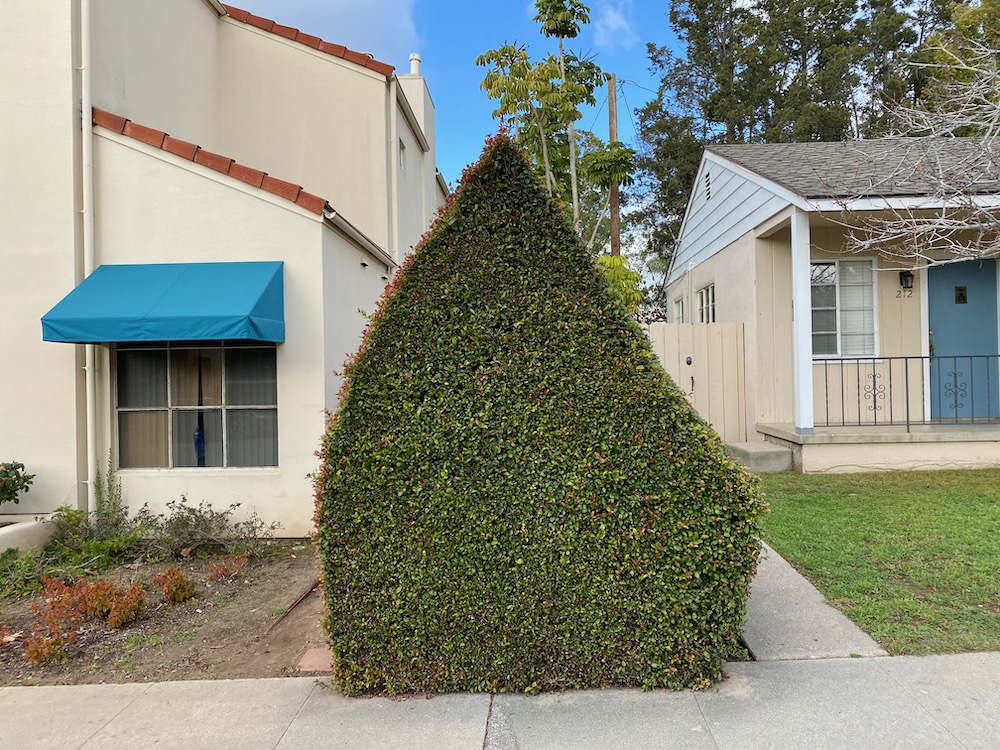 The neighborhood in question is more or less the triangle made by De La Vina Street, Pueblo Street, and Alamar Avenue. I parked at the corner of De La Vina and Pueblo, taking this wedgy hedge as a good omen. I like to think each neighbor had a different idea of how it should be trimmed.