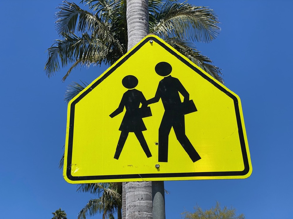 More walking, more noticing…. The sign in the window below says that “bingo in the ‘hood” is Friday at 6 p.m.; the surreal top of the Earl Warren Showgrounds poking up at the end of Baldwin Road; and a sign that has always struck me as curious. Are the figures supposed to be students? Carrying books? If so, why do they look like adults? And why is the male holding the arm of the female?