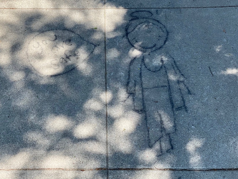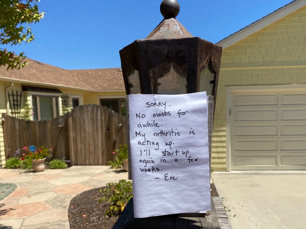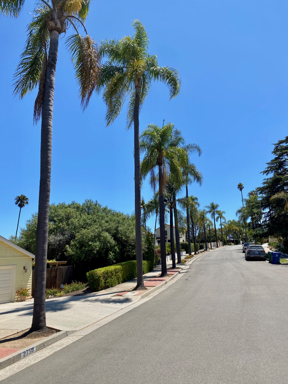 More of the details that make a place unique: a serpentine line of palms on Cuesta Road, a note from Eve, and a dog walker on one of those one-wheel electric skateboard things.