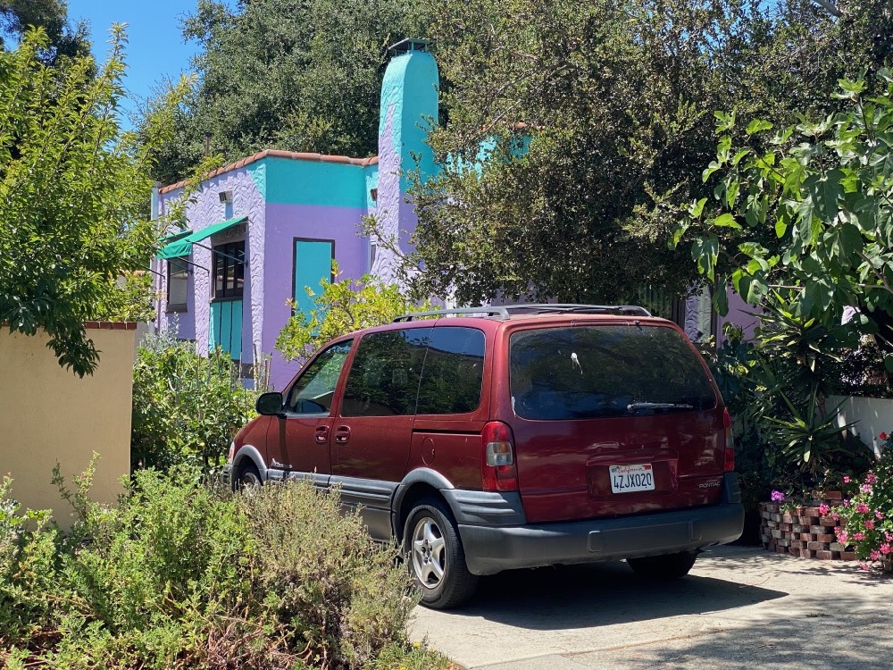 I took the below photo for two reasons: the house across the street seemed nice, raised above street level and with mountain views out back, and I wondered how there came to be a planter in the street.