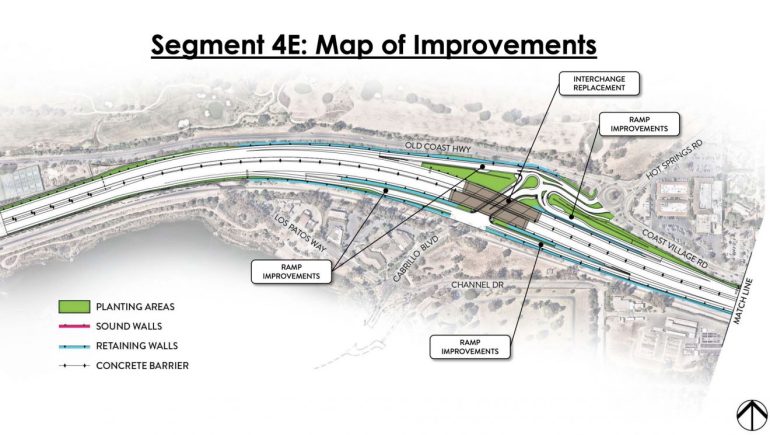 ••• The design for a new interchange at Highway 101 and Cabrillo Boulevard/Hot Springs Road was revealed a long time ago, but I suspect it’s news to some of you, and Noozhawk has a recap of a discussion about it at the city’s Architectural Board of Review. The roundabout in the rendering above would be new—i.e., adjacent to the one at Hot Springs and Coast Village Road, as you can see in the graphic at right.