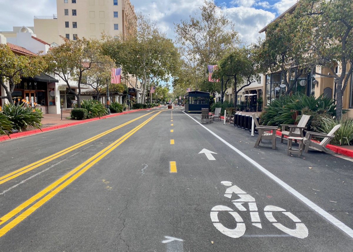 ••• The block of State Street between Anapamu and Victoria has been restriped with a two-way bike lane and a northbound lane for cars, so people can be dropped of in front of the Granada. —Independent