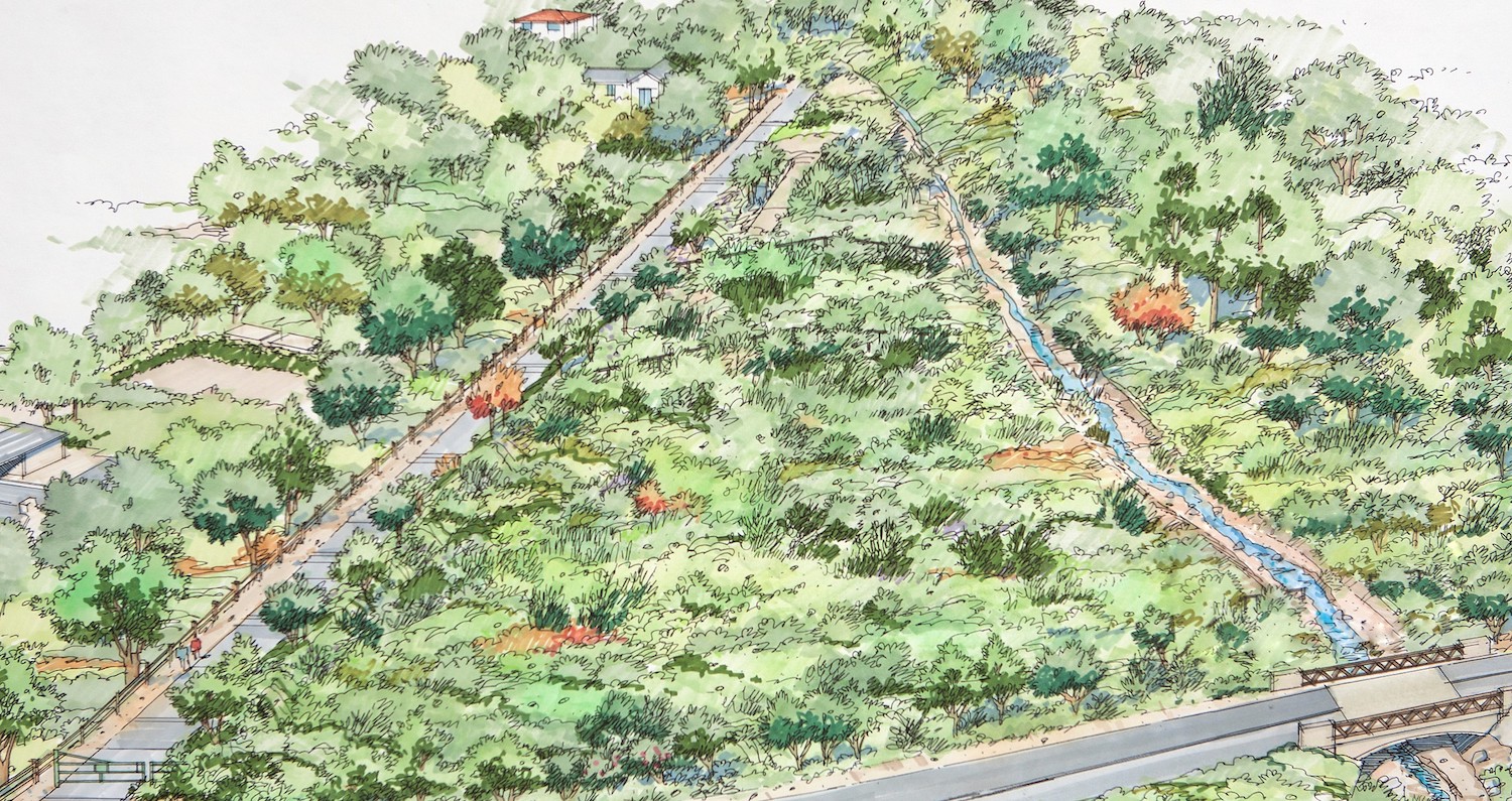 ••• “Excavation of a new debris basin along Randall Road [rendering above] and San Ysidro Creek in Montecito will begin in early May [….] The basin is designed to encompass all eight one-acre properties [including seven purchased by the county and one the owner wouldn’t sell], and the work may proceed in two phases [….] Work on the five northernmost properties on Randall Road is expected to be finished in the fall.” —Montecito Journal