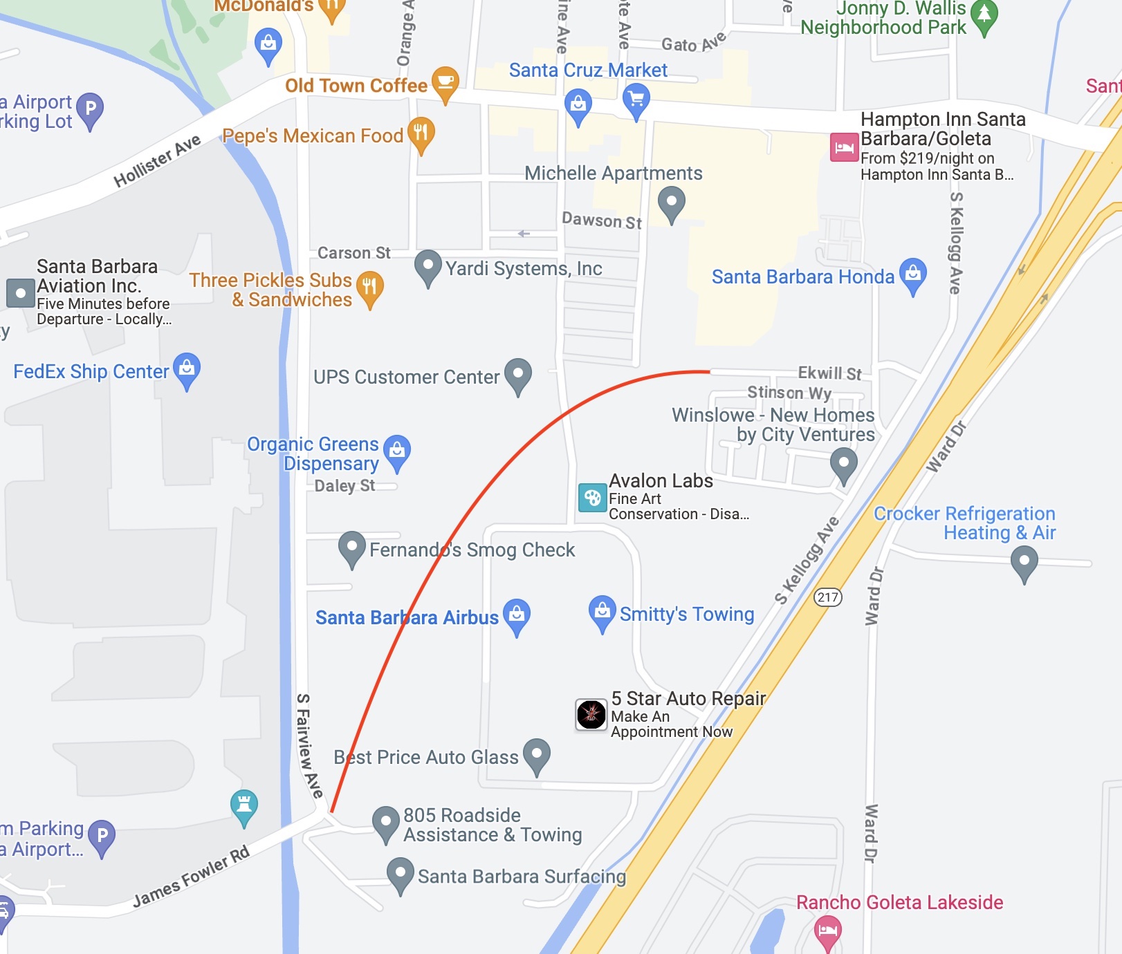 ••• Goleta’s plan “to reconfigure Hollister Avenue to one lane for cars and bicycles in each direction” has hit a snag, in that “the two recent bids on the project came in at more than $4 million each—far exceeding the city’s original estimated cost of $1.8 million.” Elsewhere in the Independent‘s article, we learn that the replacement of the San Jose Creek bridge over Hollister Avenue involves the creation of “two roundabouts—at South Kellogg and at Ward Avenue—to either side of the State Route 217 overpass.” And an “extension of Fowler Road and Ekwill Street […] has been in the works since at least 2011. Both Ekwill and Fowler are a couple short blocks between Fairview and Kellogg. By extending them toward each other, with a roundabout at Pine Avenue in the middle, the city hopes to alleviate the traffic through Old Town by providing a road parallel to Hollister.” It took me a while to figure out where Fowler and Ekwill might meet, so I made a map—the exact location for the new road may be different.