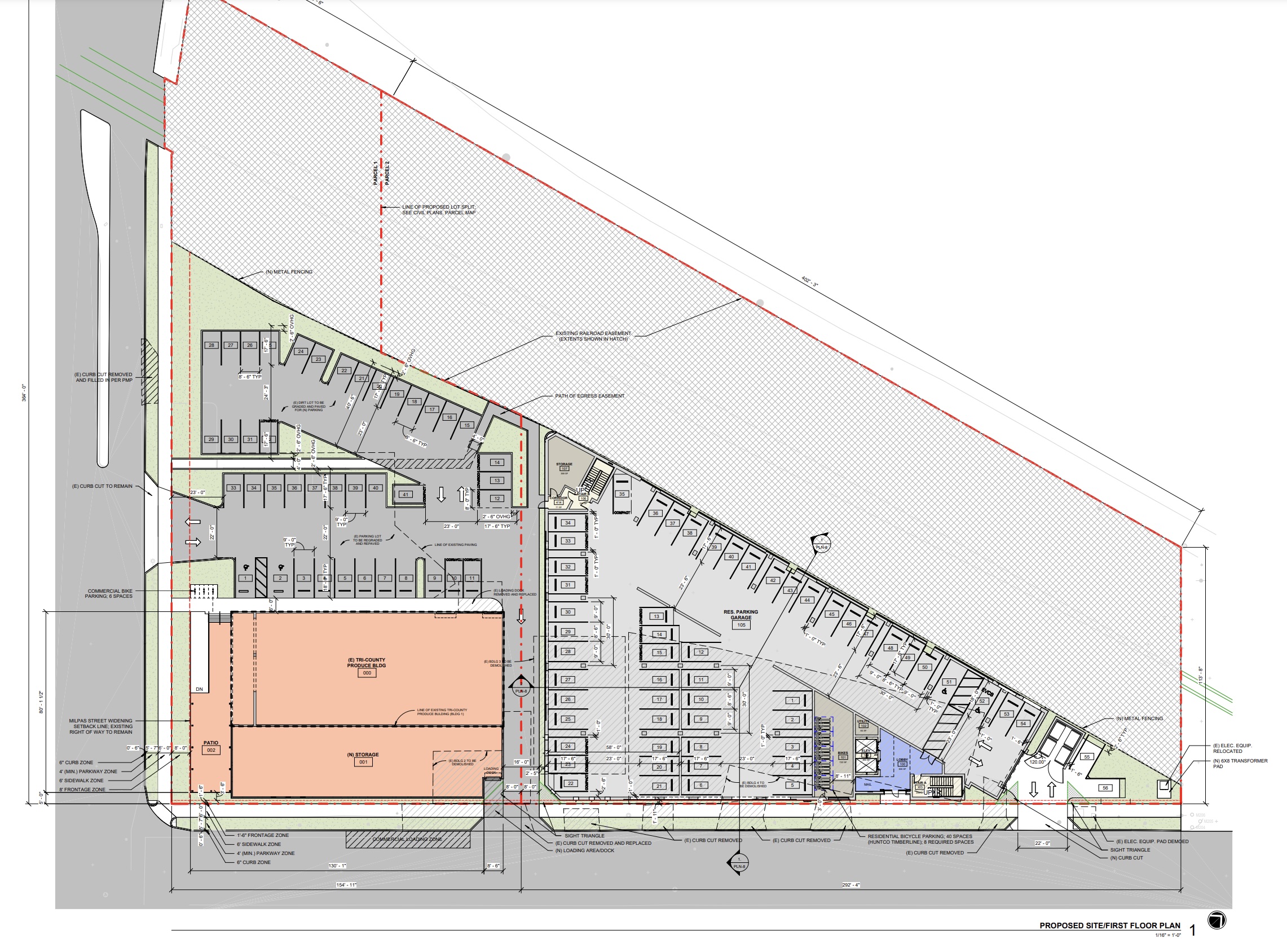 The Tri-County Produce project (53 units, average size 830 sqft) could be improved. Option 1: eliminate all residential parking and reduce the height to 3 stories. Option 2: 4 stories, but AB 1287 project with 100 units (average size 446 sqft).