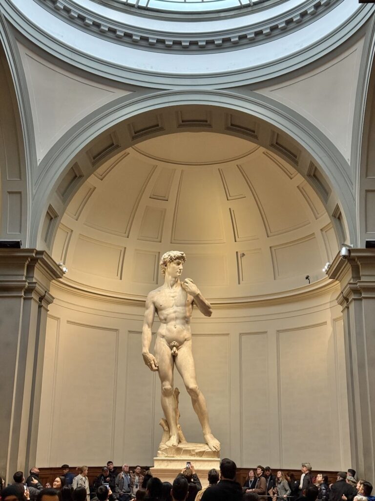 And obviously we went to see Michelangelo’s statue of David at the Galleria dell’Accademia. It’s a stunning work, to be sure. I was also interested to see so many people staring with such intensity at a male nude—in a homoerotic pose (trust me), no less—which I don’t think they’d feel comfortable doing if it were, say, a photograph. I was also amused to overhear a woman turned to the young girl at her side and asked, “Do you have any feelings about it? Did you think it would be so big?”