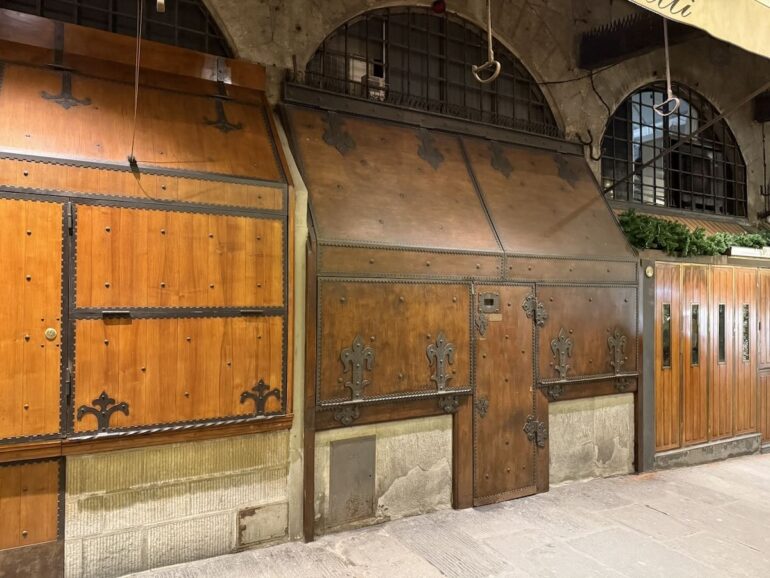 During the day, the bridge is so crowded it’s hard to even take note of the shops, most of which sell jewelry. I prefer them at night, when they get shuttered in stylish fashion.