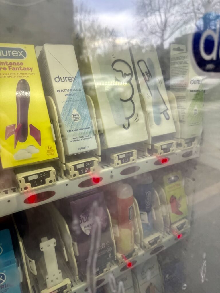 I had just about stopped investigating the sidewalk vending machines selling condoms and other urgent needs—it’s not a great look—when this one caught my eye. It upped the ante with a range of sex toys.