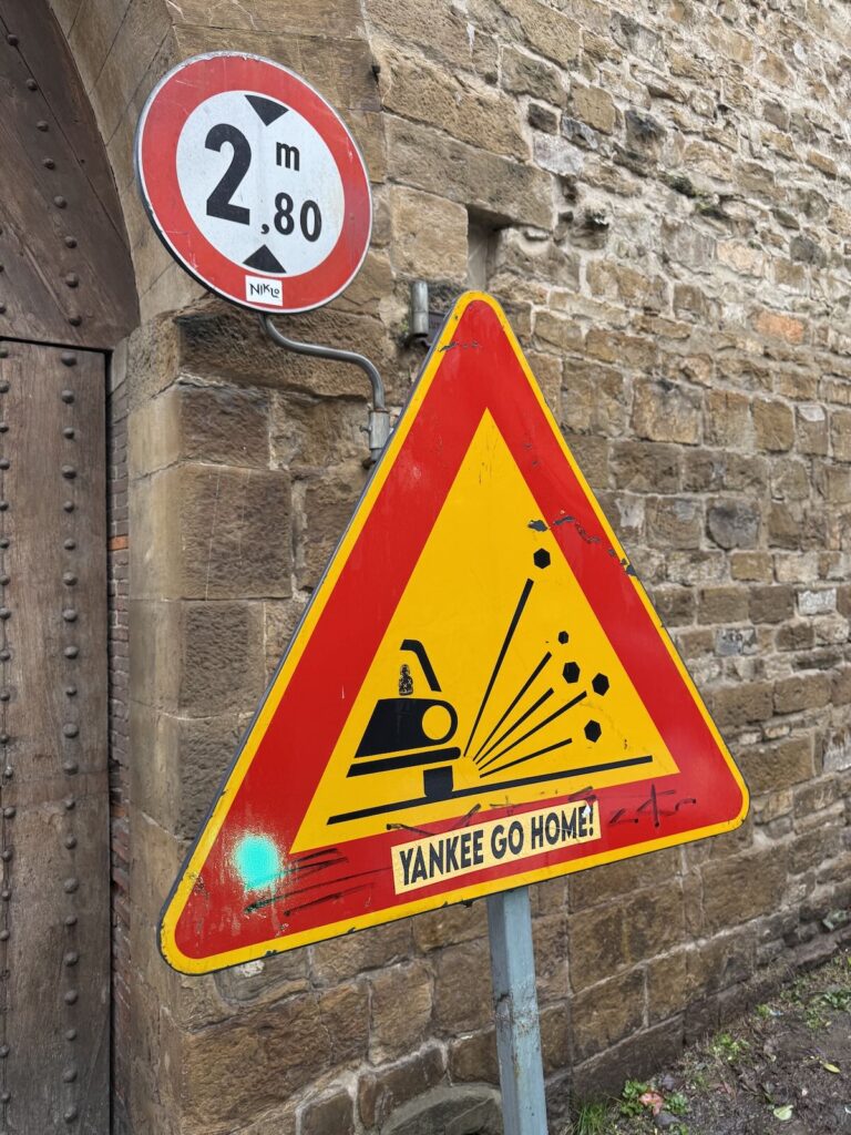 Someone has pasted “Yankee go home!” decals all over, but extracting Americans would only make a dent in the situation. Italian tourists were plentiful, too.
