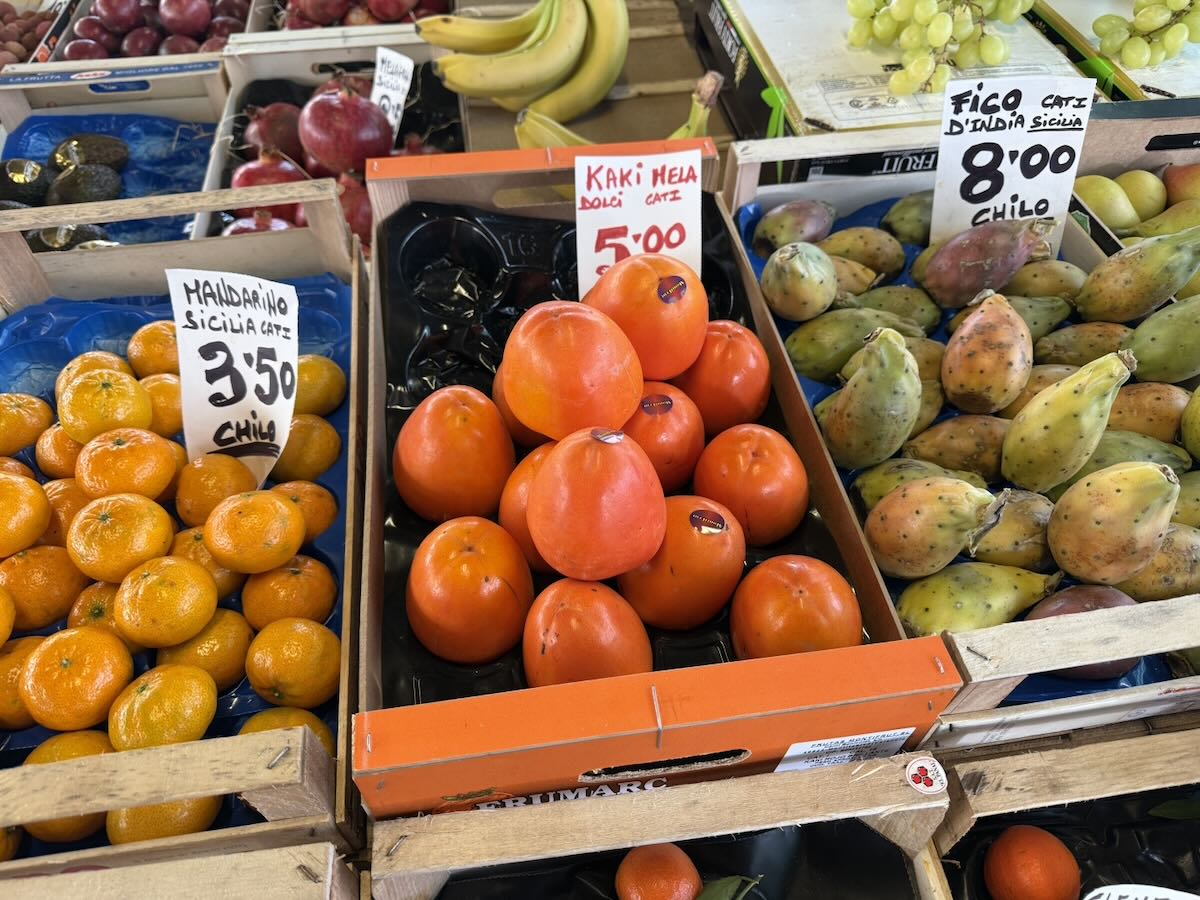 As Adam and I tend to do, we stopped by a food market—the Mercato di Sant’Ambrogio—where we bought Italian pine nuts (which came in a bag with a delectable logo) and learned something: the kaki mela, or apple persimmon, looks like a hachiya but can be eaten firm, like a fuyu.