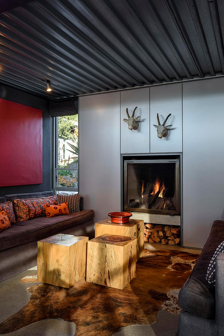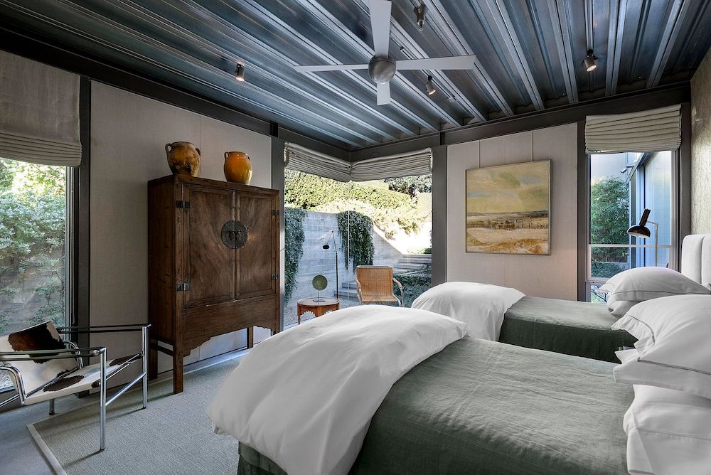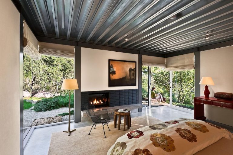The main rooms are open-plan and high-ceilinged, with windows to the north showcasing the mountain backdrop. As seems to be Myers’s style, rooms in the rear are smaller and darker (a.k.a. cozier).
