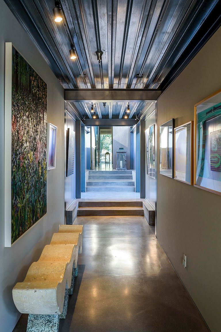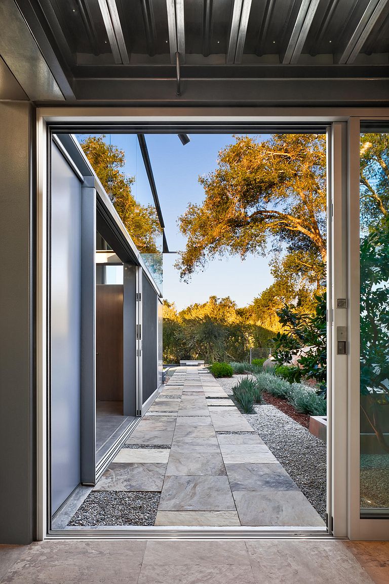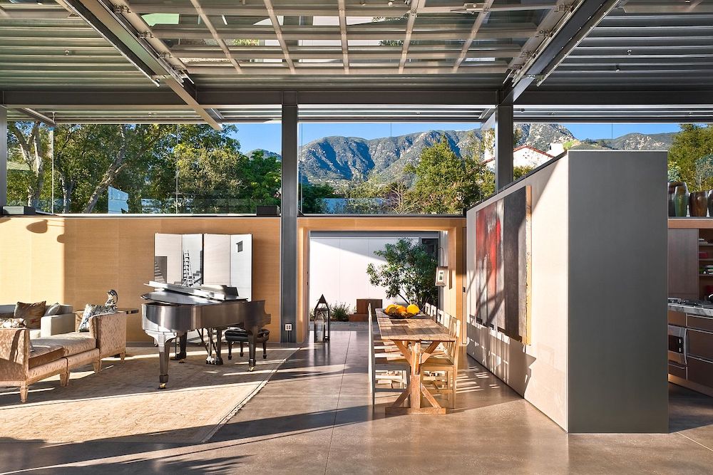 Steel and glass are the primary materials listed for the Barton Myers–designed house at 770 Ladera Lane, but the ones that first come to mind are light and air. When the big garage doors are opened all the way up, you’re as much outside as in. The effect is impossibly striking, as if you’ve wandered into a magazine spread.