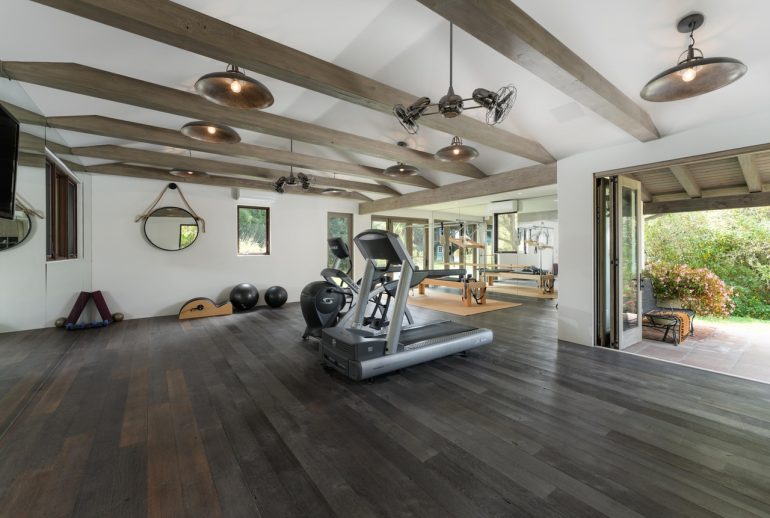 Nestled among the beautifully landscaped grounds are additional amenities and structures: A sparkling pool and adjacent pool house, a tennis court, and an exercise center complete with overhead fans and two sets of bi-folding patio doors. Just beyond the gym is an impressive treehouse with a slide, an expansive lawn area, planter beds for a garden, and even a chicken coop.