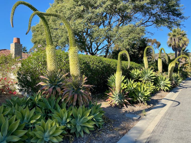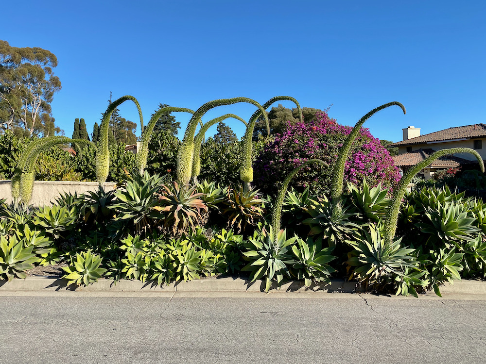 The word Seussian gets used a lot to describe local flora, and I think it’s especially applicable when agave blooms are all the pointed the same direction, as if they’re looking at something.