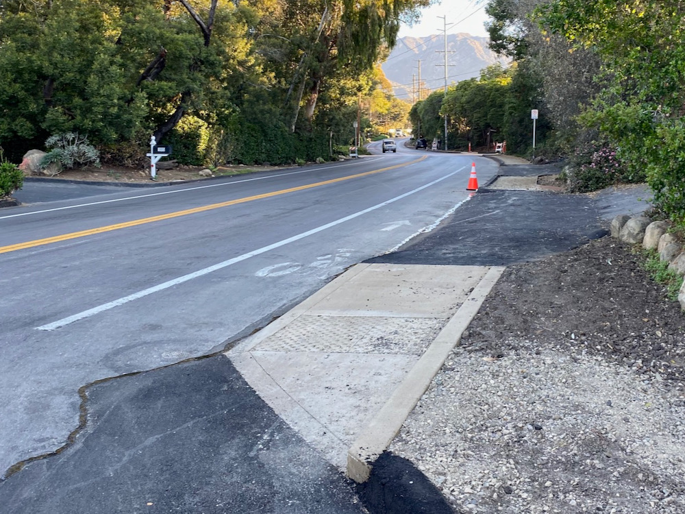 ••• I was surprised by the new sidewalk going in on Hot Springs Road below Sycamore Canyon Road, since Montecito prides itself on its “semi-rural character.” That doesn’t strike has the most useful spot for a sidewalk, since you could enter the Coast Village neighborhood and walk on Butterfly Lane or Middle Road. (Moreover, in my experience bicycling on Olive Mill Road, many residents prefer to walk in the bike lane even when a sidewalk is available.) Also, the asphalt patching between the street and the driveways is pretty unattractive.
