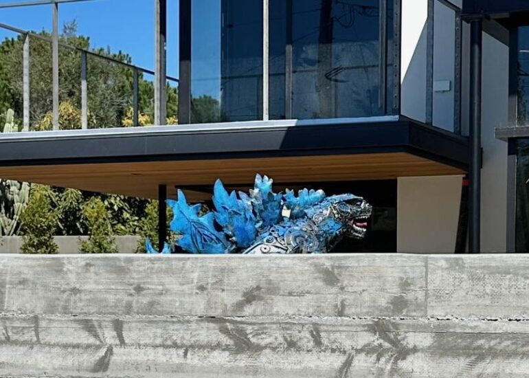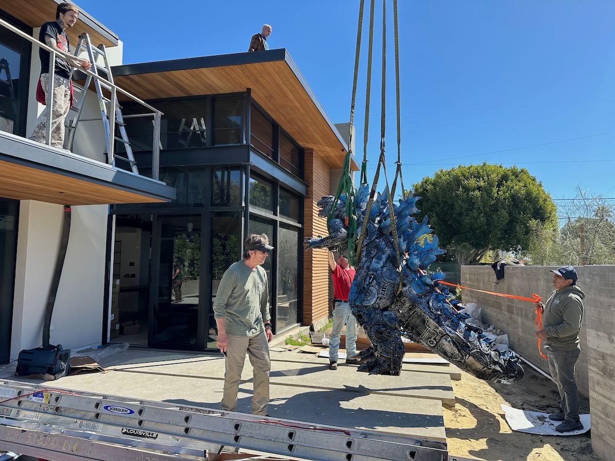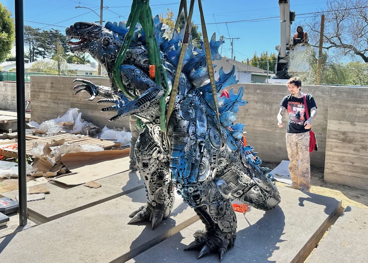 ••• Remember the two-headed dragon that showed up on Carlton Way in West Mesa? Godzilla has joined it, reports Steve Litchfield of Litchfield Builders, the contractor on the project. He sent over photos of the installation…. Now all we need is King Kong to make the trip from Montecito.