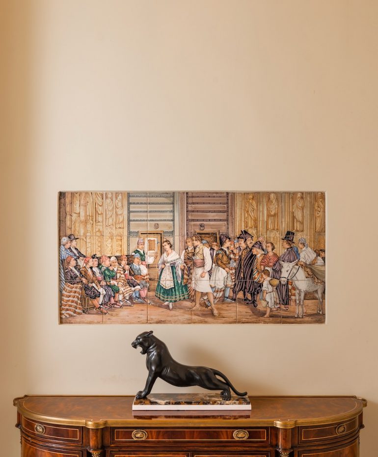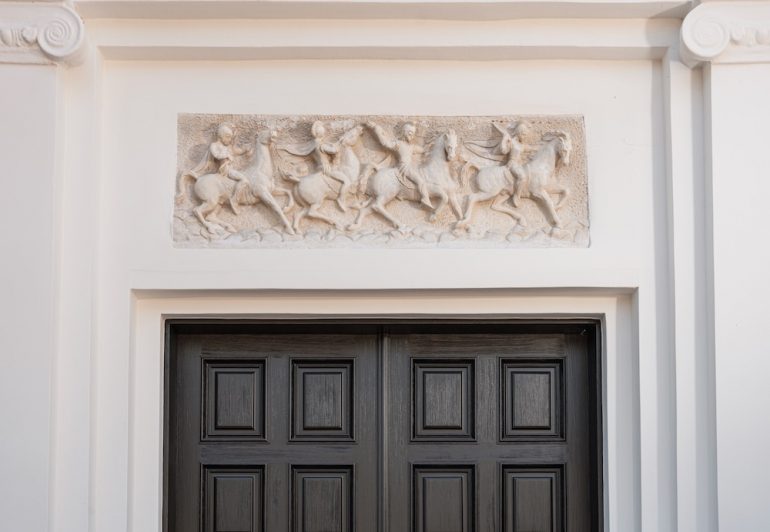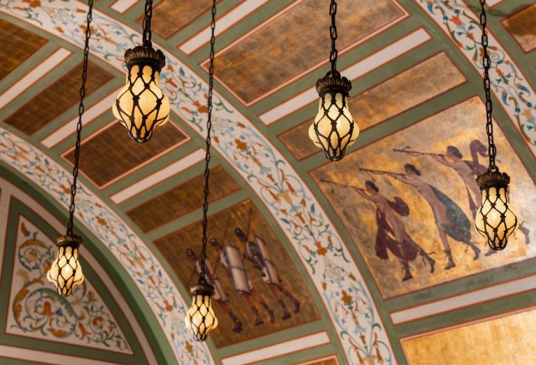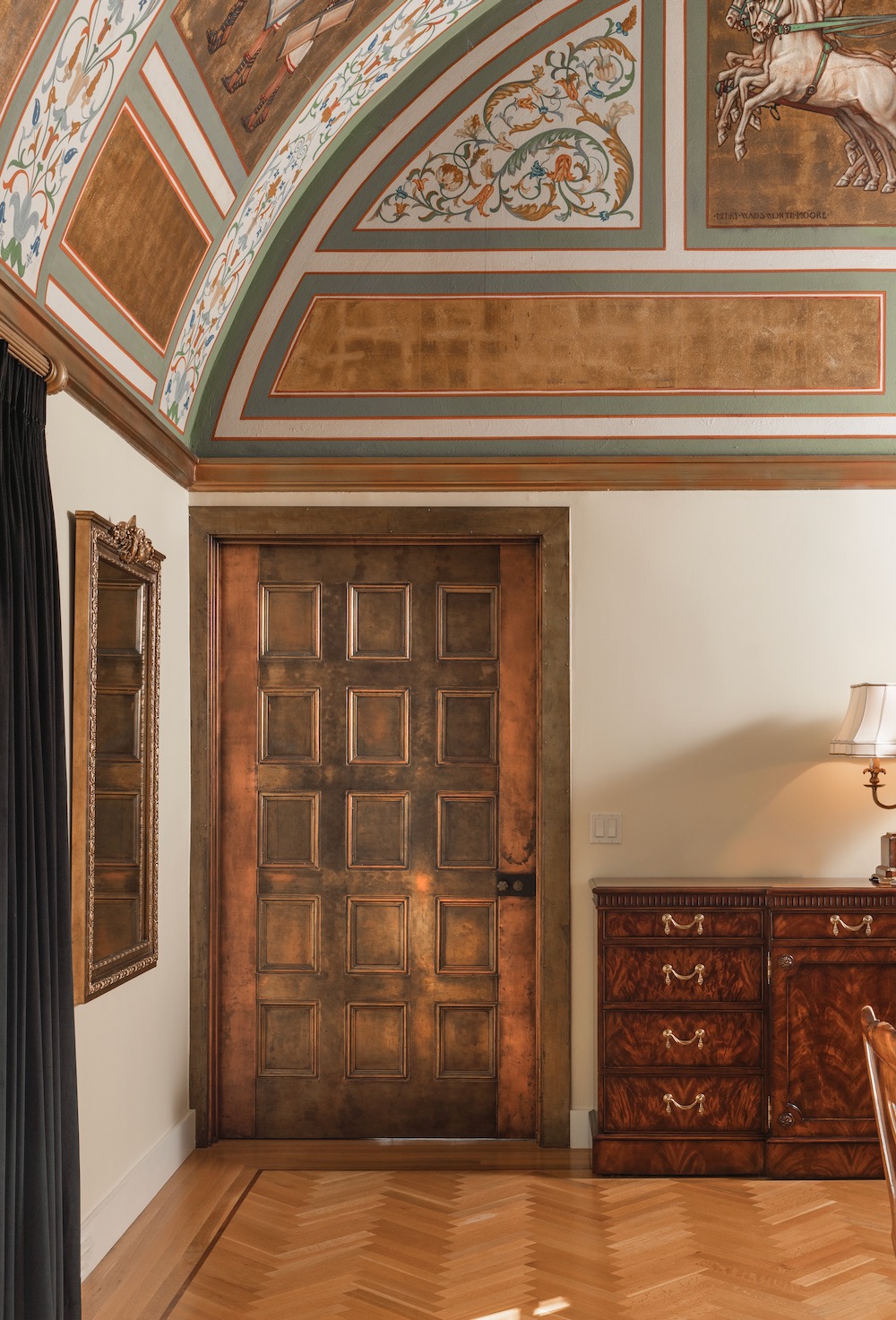 But then there’s the dining room, where a “barreled ceiling depicts a scene of Alexander the Great conquering Persepolis painted over a foundation of 24-karat gold-leaf appliqué.” Note the copper door.