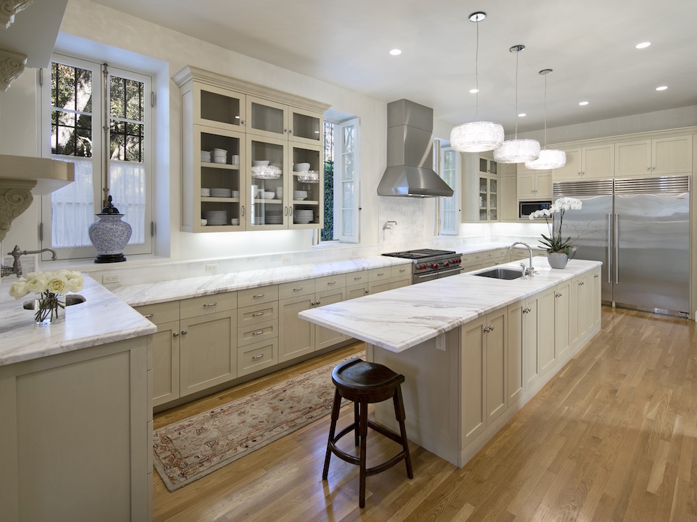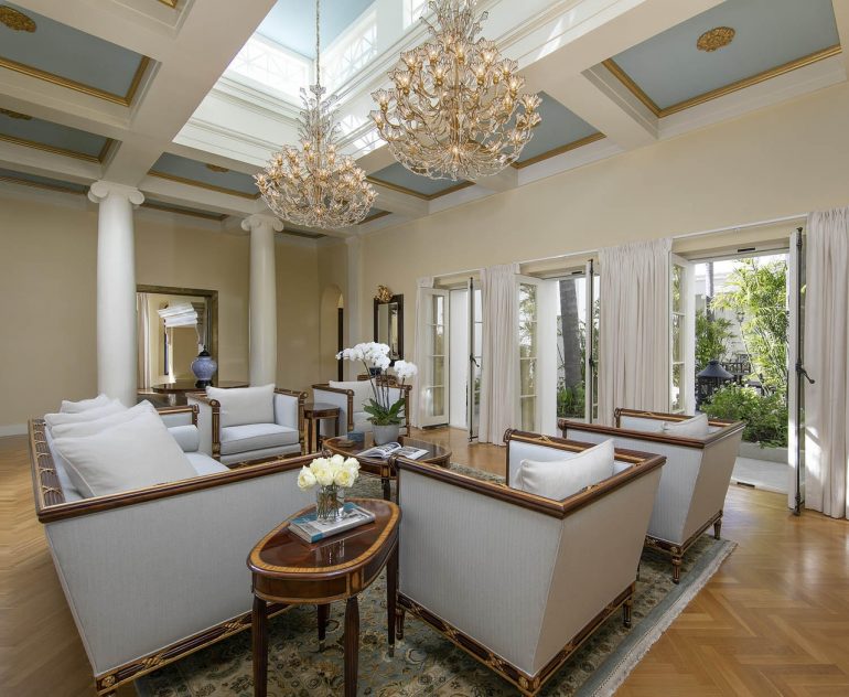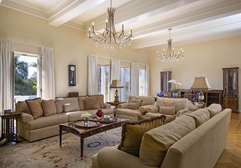 The house is a fascinating mix of the rococo and the somewhat quotidian, at least by Montecito standards. Take the living room, where a coffered ceiling, columns, and a pair of crystal chandeliers glam up a space of fairly modest proportions. Or the sitting room, which wouldn’t be out of place in the many less storied houses on Parra Grande.