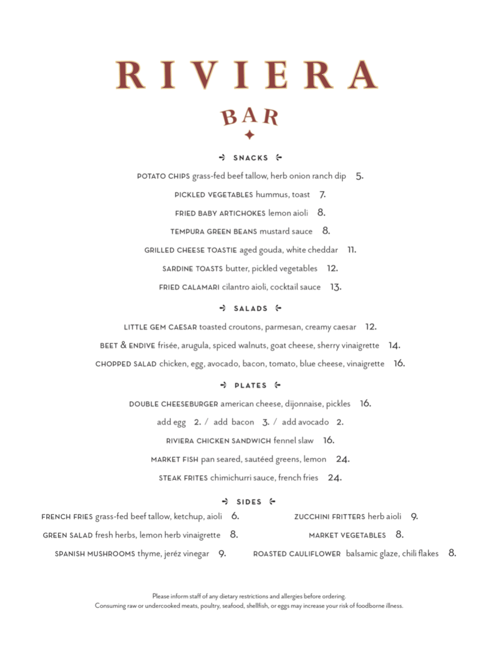 ••• Riviera Bar‘s food menu looks pretty appealing, although I wonder how the beef tallow will go over here….