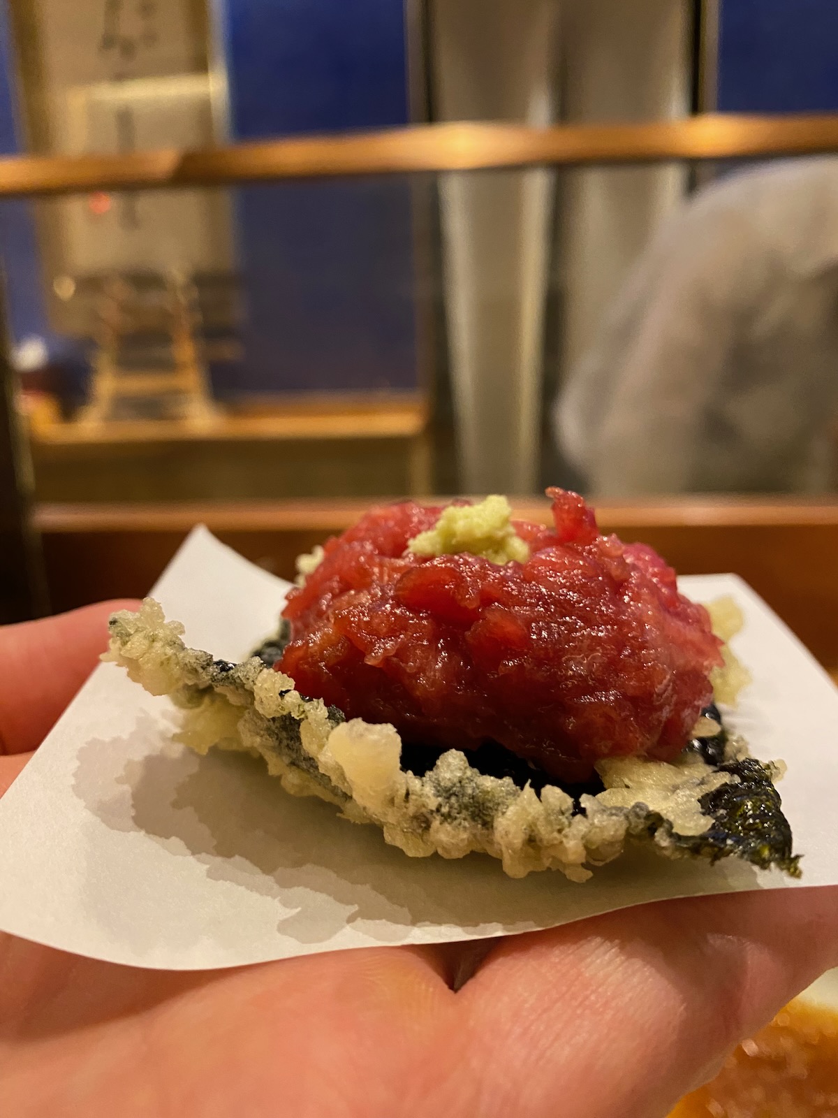 Our best meal in Tokyo was at Tempura Miyashiro, an eight-seat counter where chef Naoki Miyashiro cooks a set menu right in front of you. Tempura at this level (the restaurant has a Michelin star) is a world away from what you get here, and the meal does venture beyond fried food.