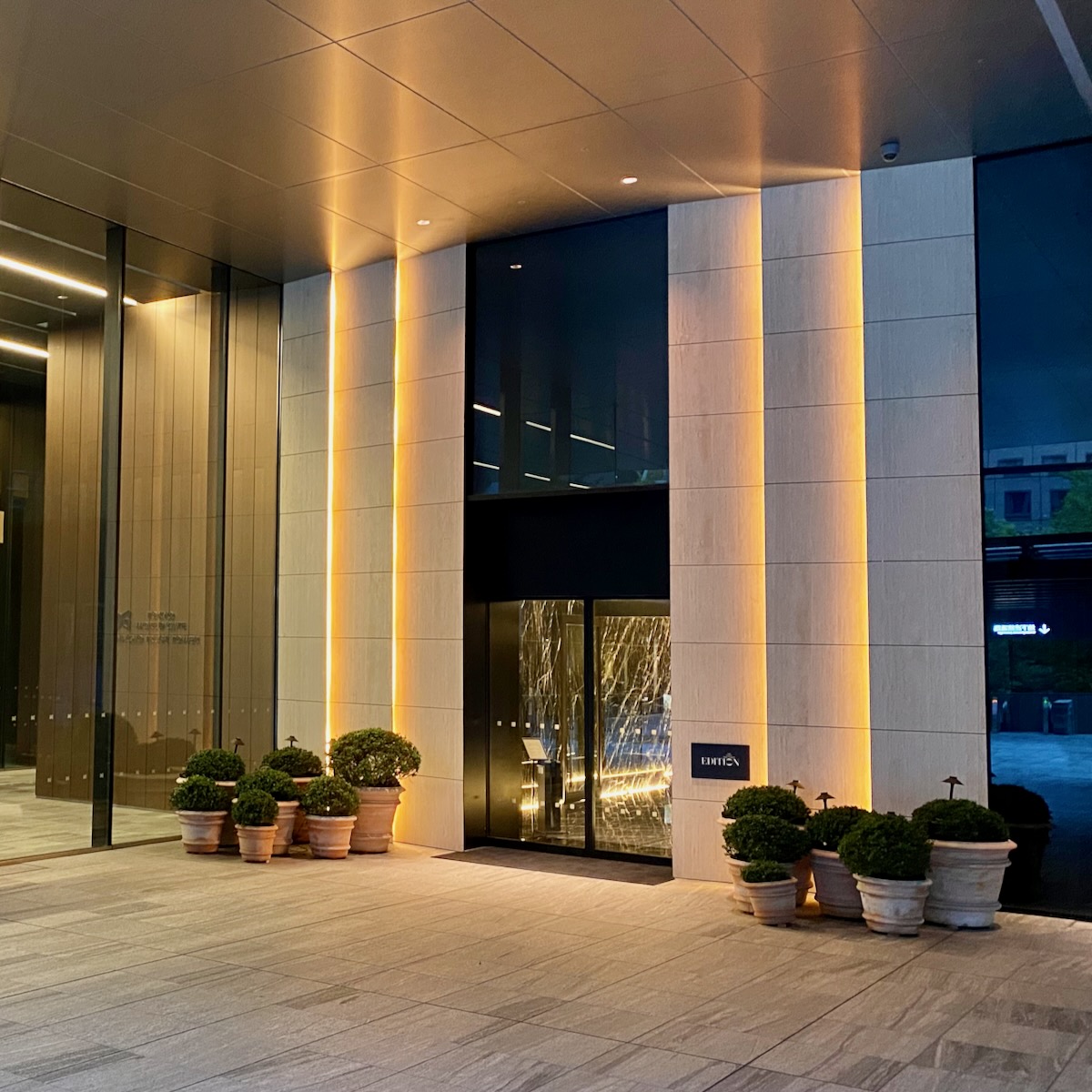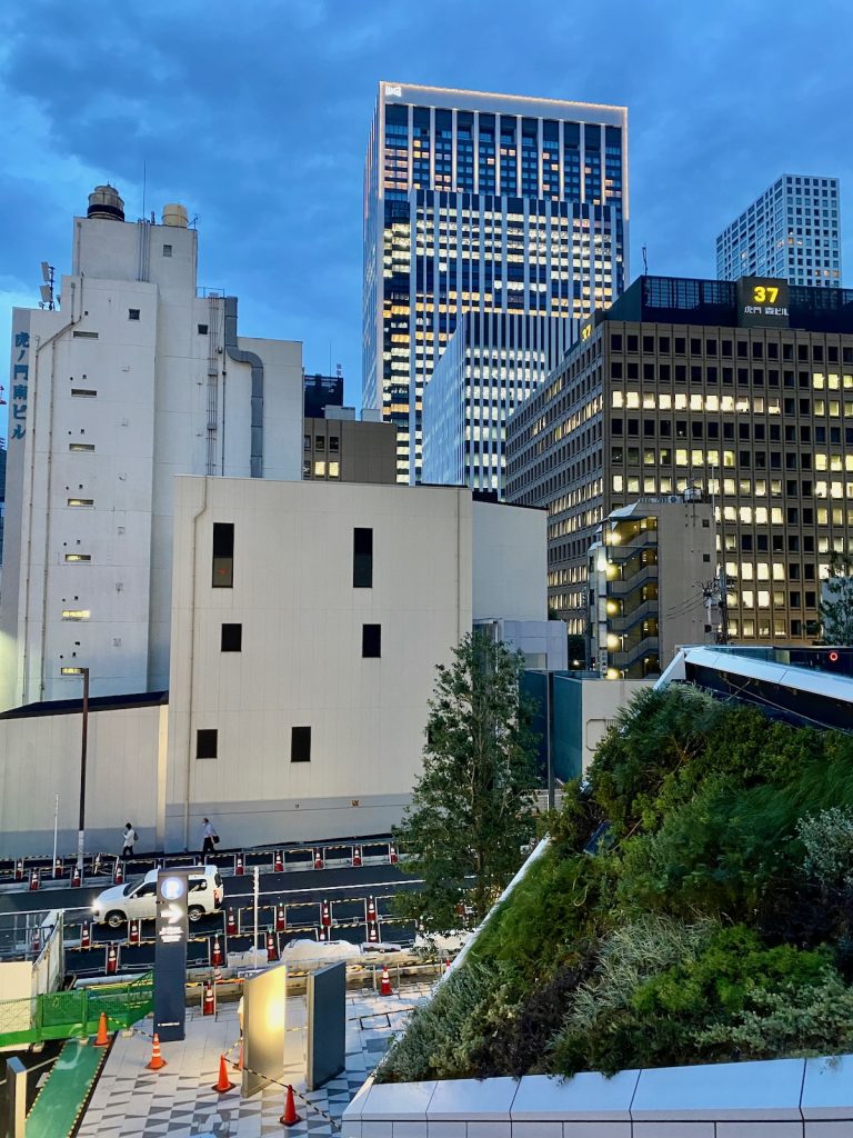 Based on friends’ recommendation, we stayed at the Tokyo Edition Toranomon, on the upper floors of the skyscraper pictured below. The Edition brand is Marriott’s partnership with legendary hotelier Ian Schrager, and while the 31st-floor lobby tries too hard to be cool—loud music and office plants everywhere, positioned so that they tickle the head of anyone who sits down—the views were amazing, including from the restaurant where breakfast is served.