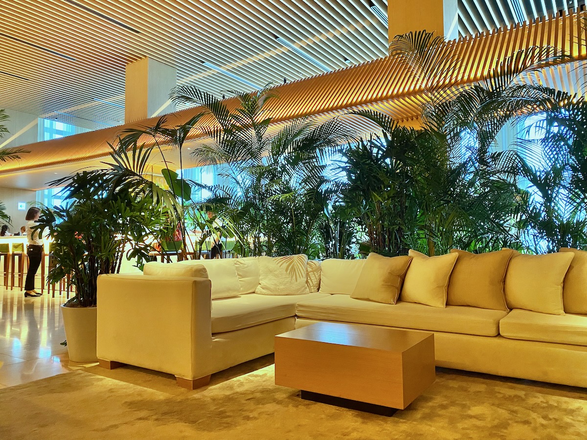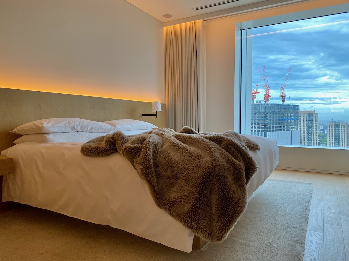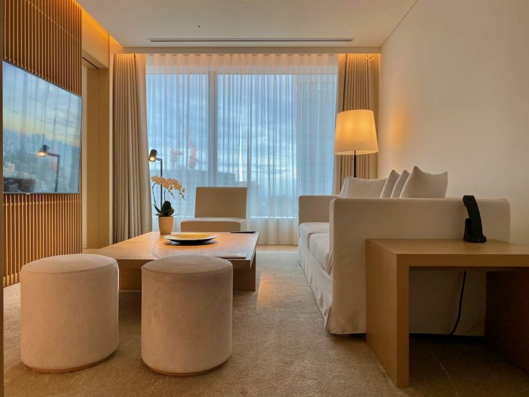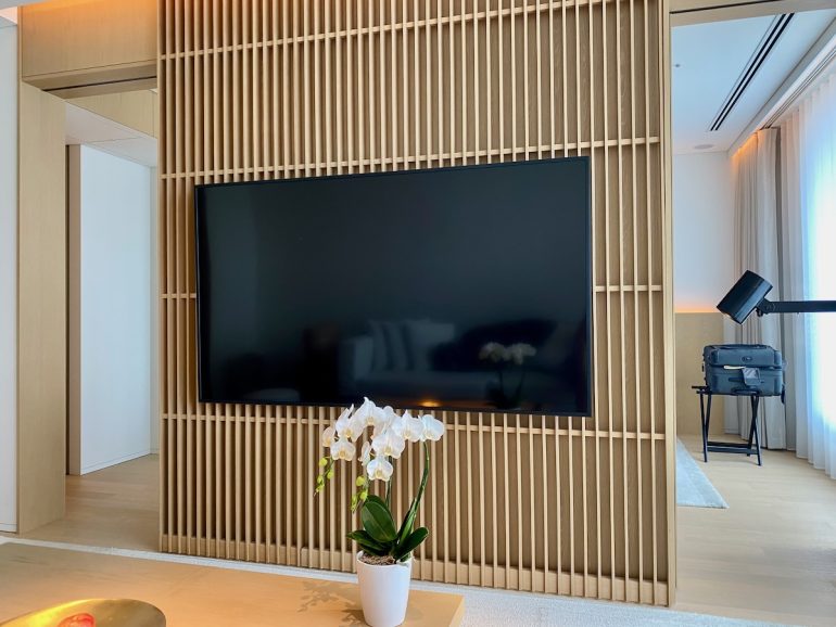 And our room hit the spot. We booked a suite, because I tend to get up earlier to work, and through a stroke of luck, the hotel put us at the end of the hallway, so no one ever walked by—and even if they did, the bedroom was far from the door. I like that in any hotel, but even more when faced with brutal jet lag. (Tokyo is 16 hours ahead of us.) That said, minimalism requires constant upkeep, and while the hotel currently benefits from its newness—it opened in the fall of 2020—the walls may need to be painted as often as Disneyland, judging from the scuffs we saw. Two more quibbles: the room had one of those LEDs that’s a de facto nightlight (which I covered with a Band-Aid), and ugh, why the massive TV? Don’t people bring their own devices these days?