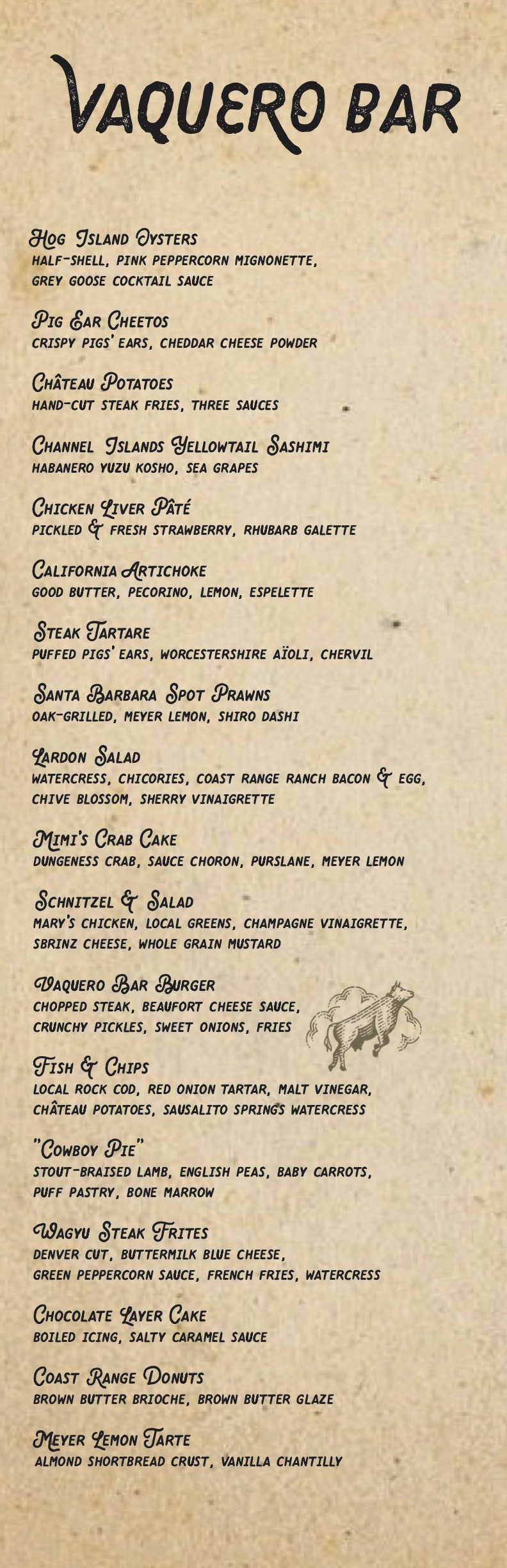 ••• Here’s a preliminary menu for Vaquero Bar, part one of the ambitious Coast Range project in Solvang. Vaquero Bar opens in early April, with the restaurant and café components to follow. Love “good butter” as an ingredient….