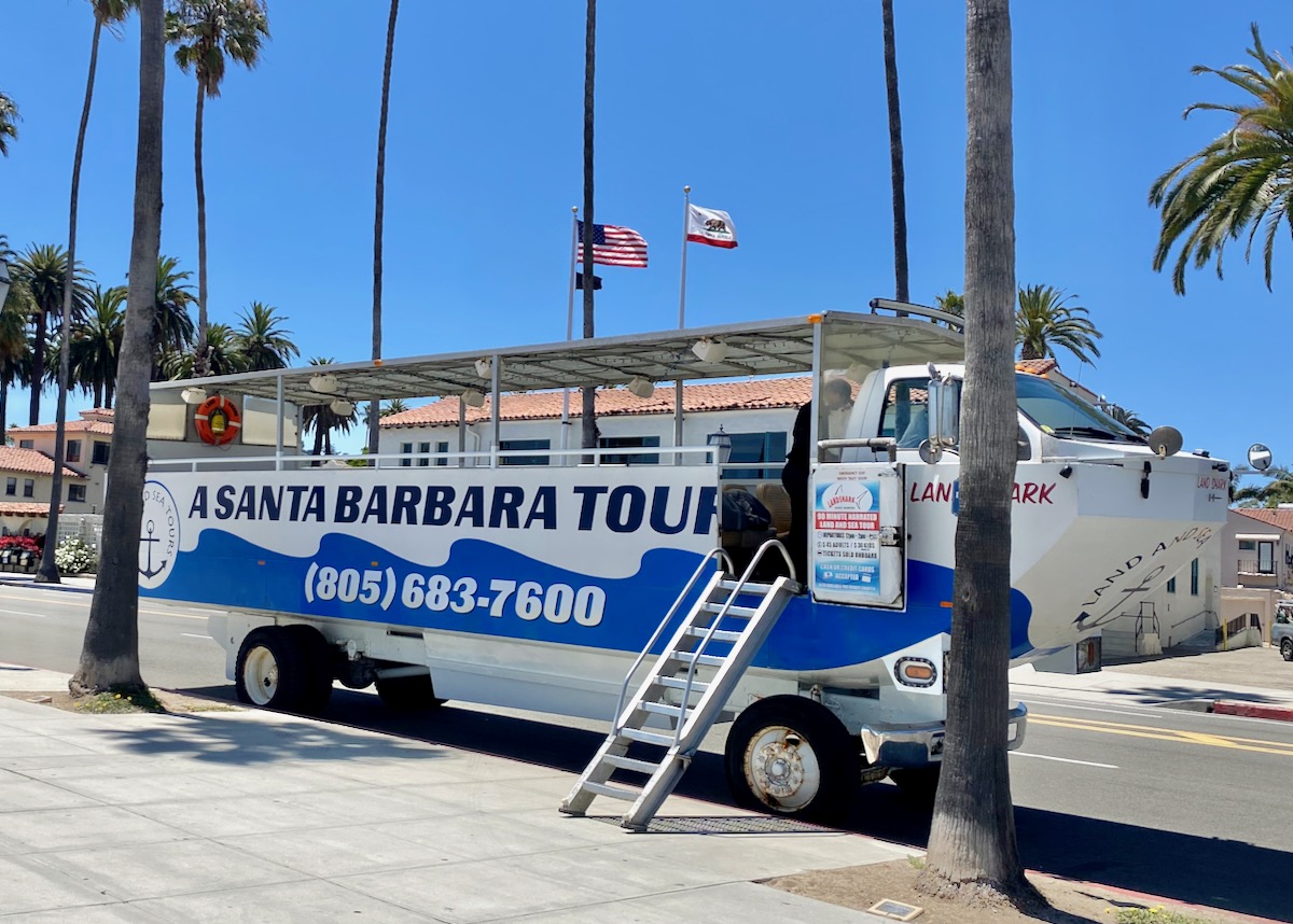 The tour is 45 minutes on land and then 45 minutes on water. The land route does a nice job of hitting the highlights: the Funk Zone, MOXI, Jeff Shelton’s El Andaluz building, the site of the Saturday farmers’ market, the Santa Barbara Historical Museum, the Presidio, the County Courthouse, the train station, and so on.