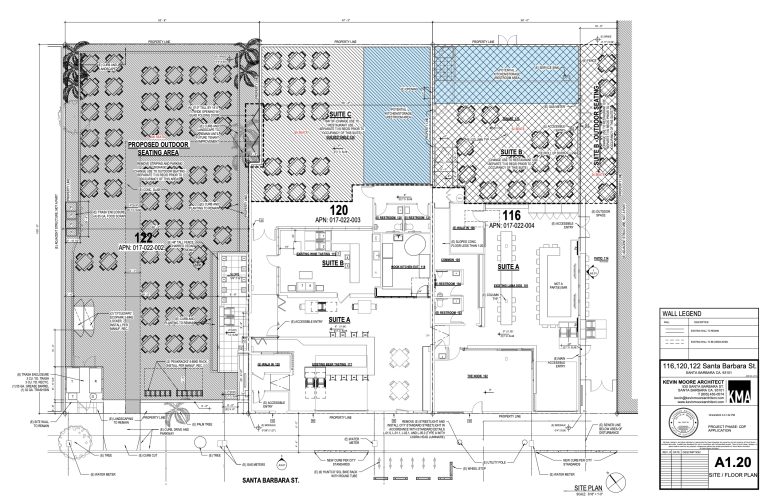 ••• The Architectural Board of Review’s December 11 consent agenda includes an expansion of the capacity at the multi-tenant Waterline complex (home to Lama Dog, Topa Topa, the Nook, et al) in the Funk Zone: “Change the use of two existing industrial tenant spaces within the two existing nonresidential buildings to be occupied by future restaurant tenants and convert the existing parking lot [below] to outdoor patio seating for customers. […] The project would eliminate all onsite parking with the conversion of the parking lot to outdoor dining. Onsite automobile parking is no longer required for commercial uses on the property pursuant to State Assembly Bill 2097.” (That law, explains L.A. City Planning, “prohibits public agencies or cities from imposing a minimum automobile parking requirement on most development projects located within a half-mile radius of a major transit stop.”) The floor plan submitted to the ABR shows an additional 336 seats. Good thing most of those customers will be taking the bus or train….