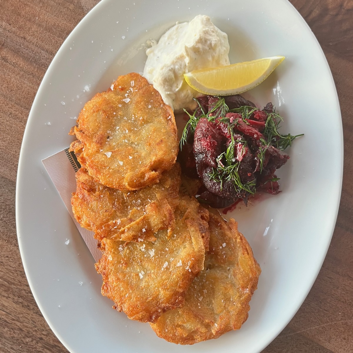 ••• “Do you know of any local bakeries that make Jewish baked goods for Hanukkah?” asked S. Well, through December 14, Hook & Press is making raspberry cardamom jam–filled sufganiyot, and Bettina is serving terrific latkes with either beet “pastrami” and horseradish cream (below) or caviar and crème fraîche. (Not a baked good, but whatever.) Too late for Hanukkah, but surely worth remembering, Merci has chocolate babka with orange blossom syrup on its special-order Christmas menu. Anyone aware of anything else? UPDATE 12/13: Julie says that Bossie’s Kitchen and Eller’s Donut House also have sufganiyot. UPDATE 12/13: “It’s a little late but you might want to add the Jewish Federation as a source of baked goods,” says D. “They can be ordered online and are available every Friday. They are made at a bakery in L.A. on Fairfax by a man who also lives in Santa Barbara.”