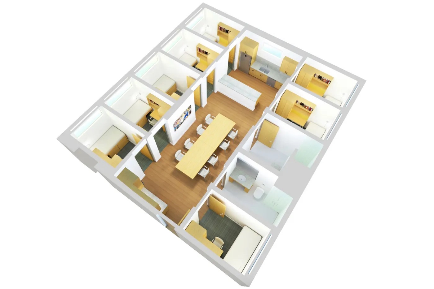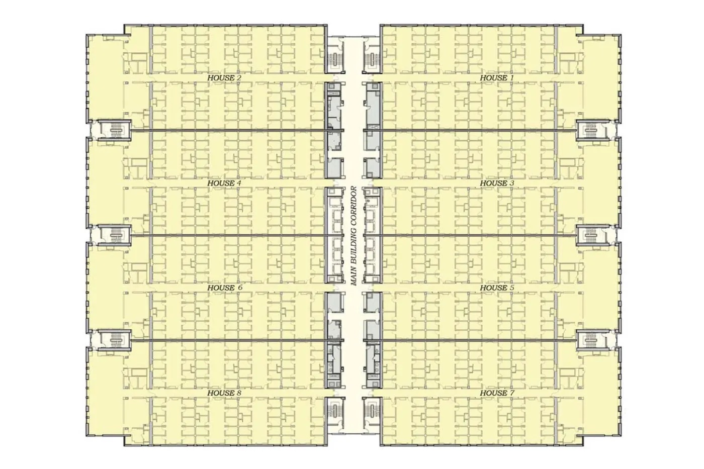 The non-architect’s other, smaller work includes a graduate residence at the University of Michigan, which also largely eschewed windows. Its plan also groups people into little colonies—but in this instance, each bedroom has its own bathroom. So, really, it’s more hospital than prison. It is also extremely ugly, and every aesthetic decision made there, from the showerheads to the countertops to the paint, is disgusting. The Munger Graduate Residence at Stanford is also comparatively luxurious—every apartment unit there has a bathroom “for each student.”