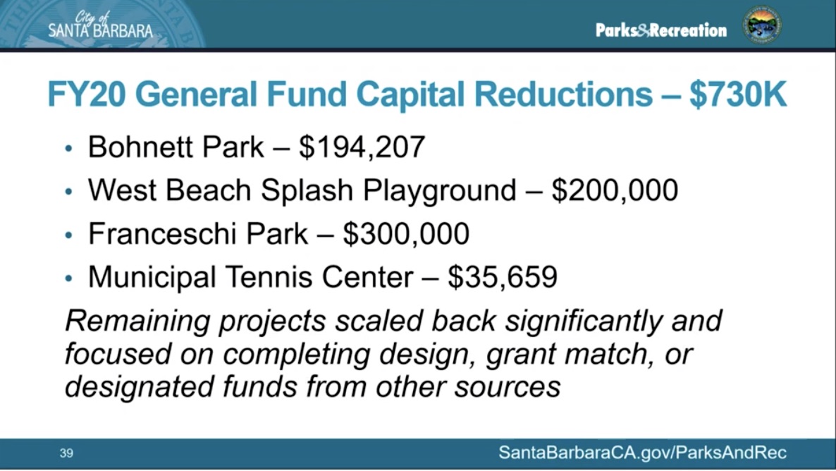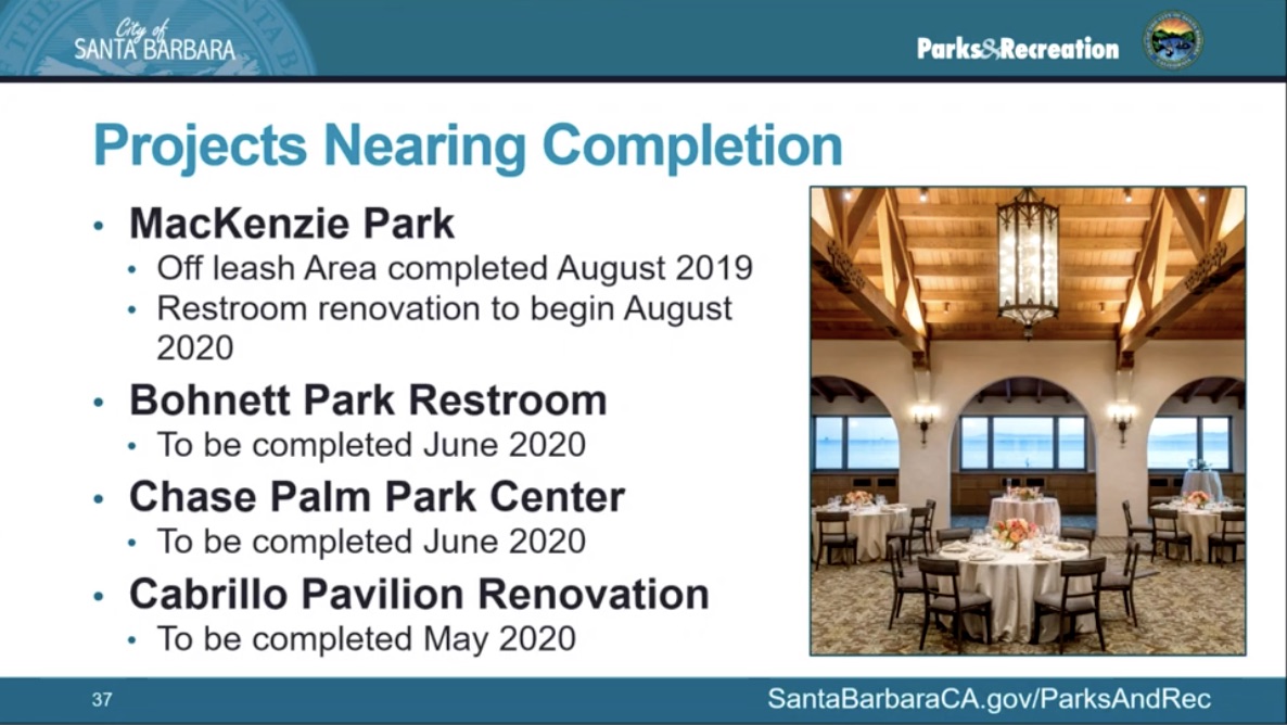 ••• The Parks & Recreation department sent out an email about its Ortega Park renovation, saying, “the Santa Barbara City Council will hear a presentation on the Parks and Recreation Department budget for 2021 [last Tuesday]—and this will include recommendations concerning funding for the future of the Ortega Park Master Plan. The budget presentation also unfortunately includes some budget reductions due to Covid-19 impacts.” A reader asked me if the cuts might affect the pool, which would be a shame, because this city could use more lap pools. I haven’t heard back from Parks, but I did watch that part of the city council meeting. The Parks presentation starts at 1:02, and while there was nothing about changes to the Ortega Park design, other items of note came up.