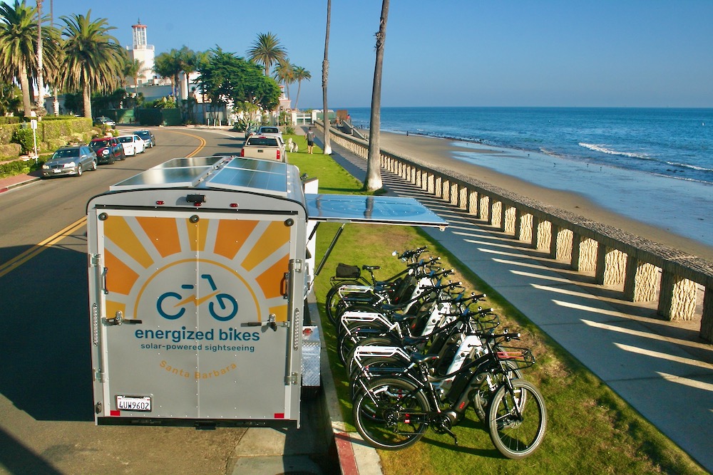 ••• If you’re interested in an electric bike tour, check out Energized Bikes: “Building on over a decade of experience owning a Santa Barbara-based sustainable wine tour business, owner Bryan Hope is now offering daily waterfront and city tours on solar-charged electric bicycles. The power used to propel his e-bikes is derived directly from his transport trailer’s rooftop panels. Soon to come, this trailer will be towed by a Ford F-150 electric truck, whose energy will be offset by Hope’s existing household solar array. His hour-and-a-half city tours are a ‘resource-reduced’ way to experience Santa Barbara’s scenery and history first-hand.”