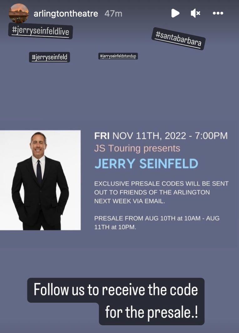 ••• Jerry Seinfeld will play the Arlington Theatre on November 11.