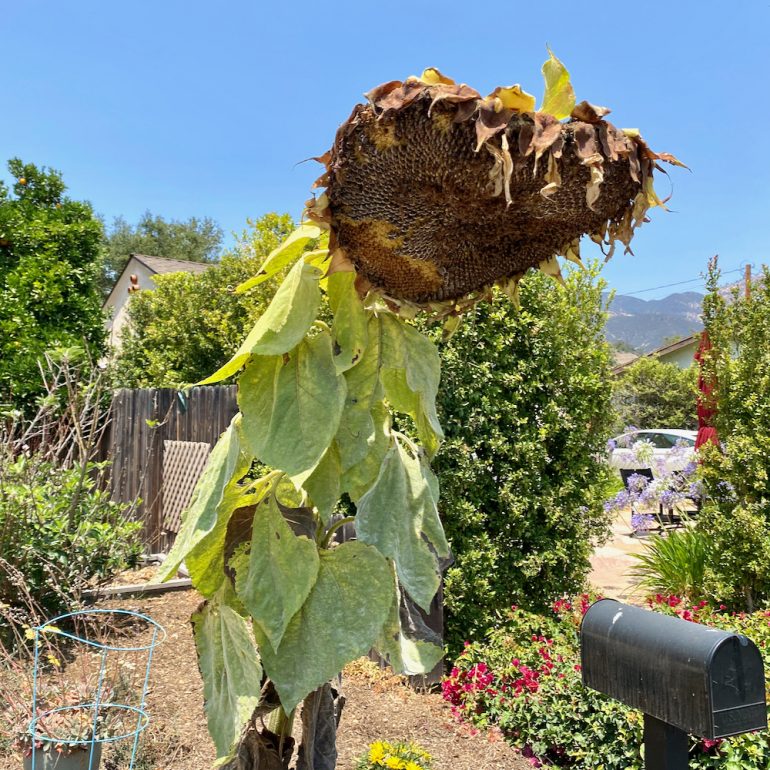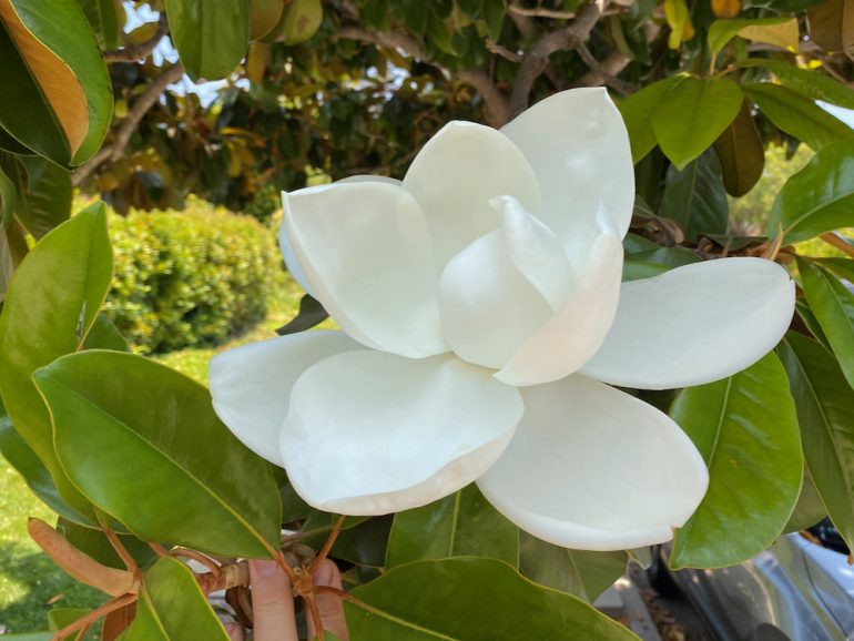 Magnolia blossoms are rarely low enough to get a good look. Even with this one, I had to pull the branch down, as you can see from my fingers’ cameo appearance. It made a stark contrast to a mammoth zombie sunflower.