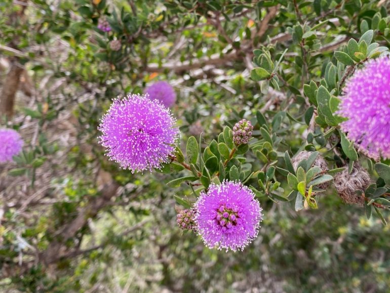 I know these plants—the flowers are little pompoms at the end of the branch—from the southbound 101 offramp at Hot Springs, but I hadn’t ever seen them up close.