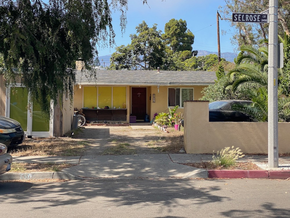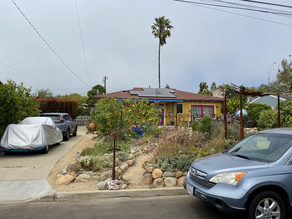 West Mesa is bordered by Meigs Road, Cliff Drive, and the Douglas Family Preserve. My husband, Adam, and I parked in the northeast of the neighborhood, on Oliver Road, and headed east on Elise Way. Immediately we struck gold peach with a house and car painted to match, followed by a property where someone, at some point, went all in on palms.