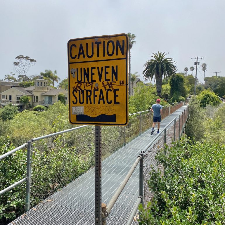 The other reason I was hot to walk West Mesa was because I had only recently learned of the pedestrian bridge linking the park and the eastern edge of the neighborhood. While the “uneven surface” qualifies as a potential hazard, it’s nothing compared to falling over the railing. The houses on either side of the ravine have terrific views, and the ravine itself is surprisingly lush.